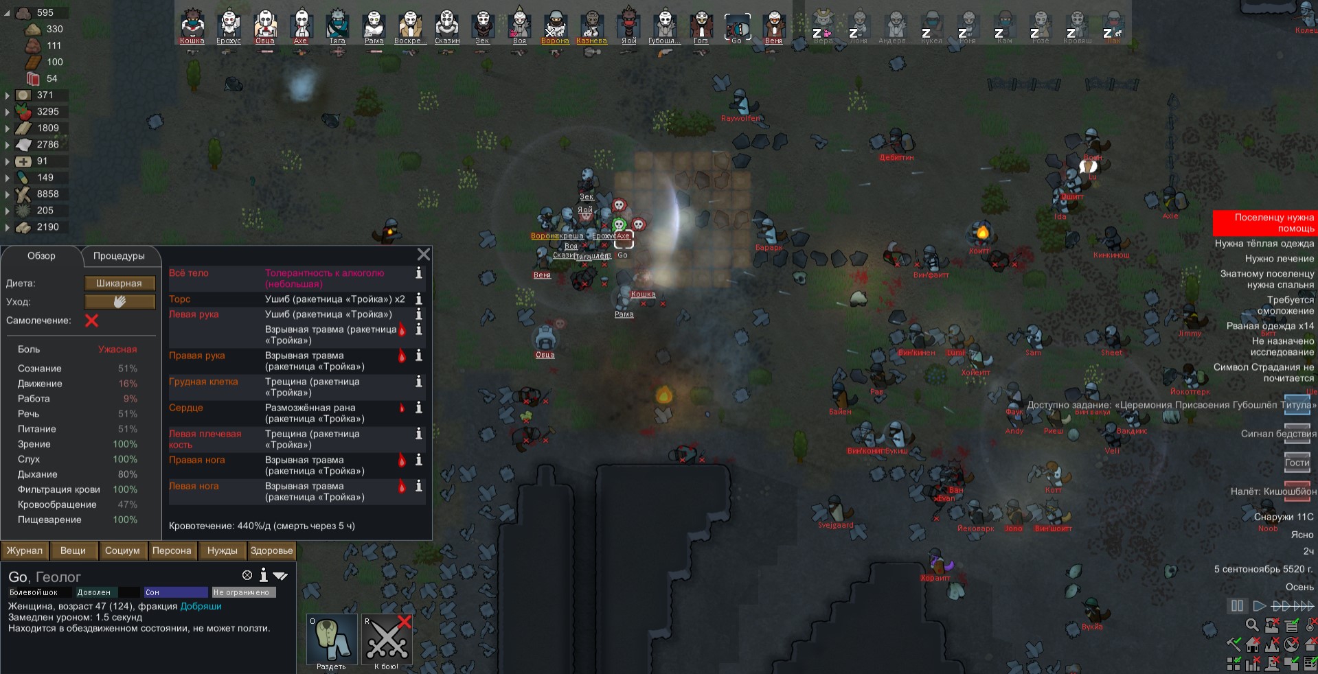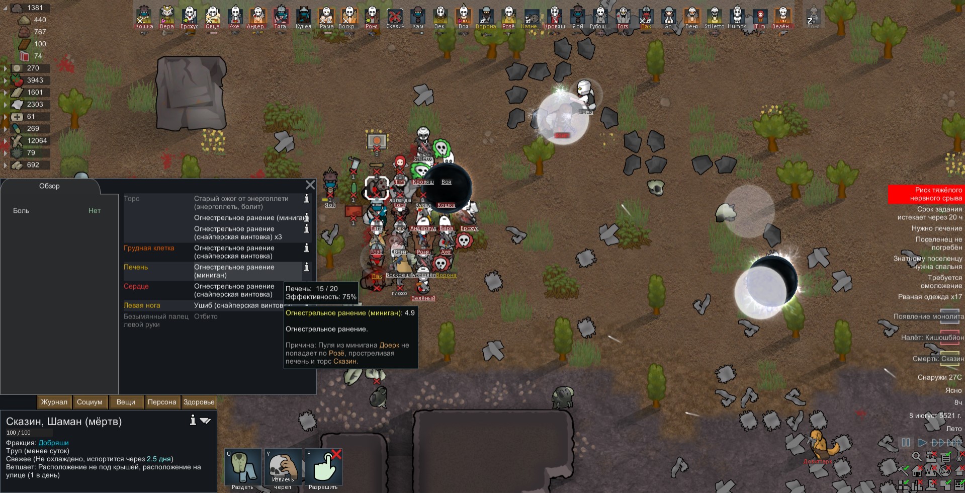 >>50352605 Что в слове "бомжей" тебе не понятно? >>50352581 Гг вп блеать. 9 из 12 двинули копыта. Один выжил чисто благодаря тому что смог отползти подальше от центра пока ему повторно не вломили, оттуда уже его удалось подобрать медику в кустах в снике. Ещё одного удалось спасти медиком бегом, но потом ему сломали руку и он не смог поднять следующего. Рейдеры всё гуляют. Придется откатиться выжившими, нанять наёмников и новых пешек и попробовать вкатиться повторно.