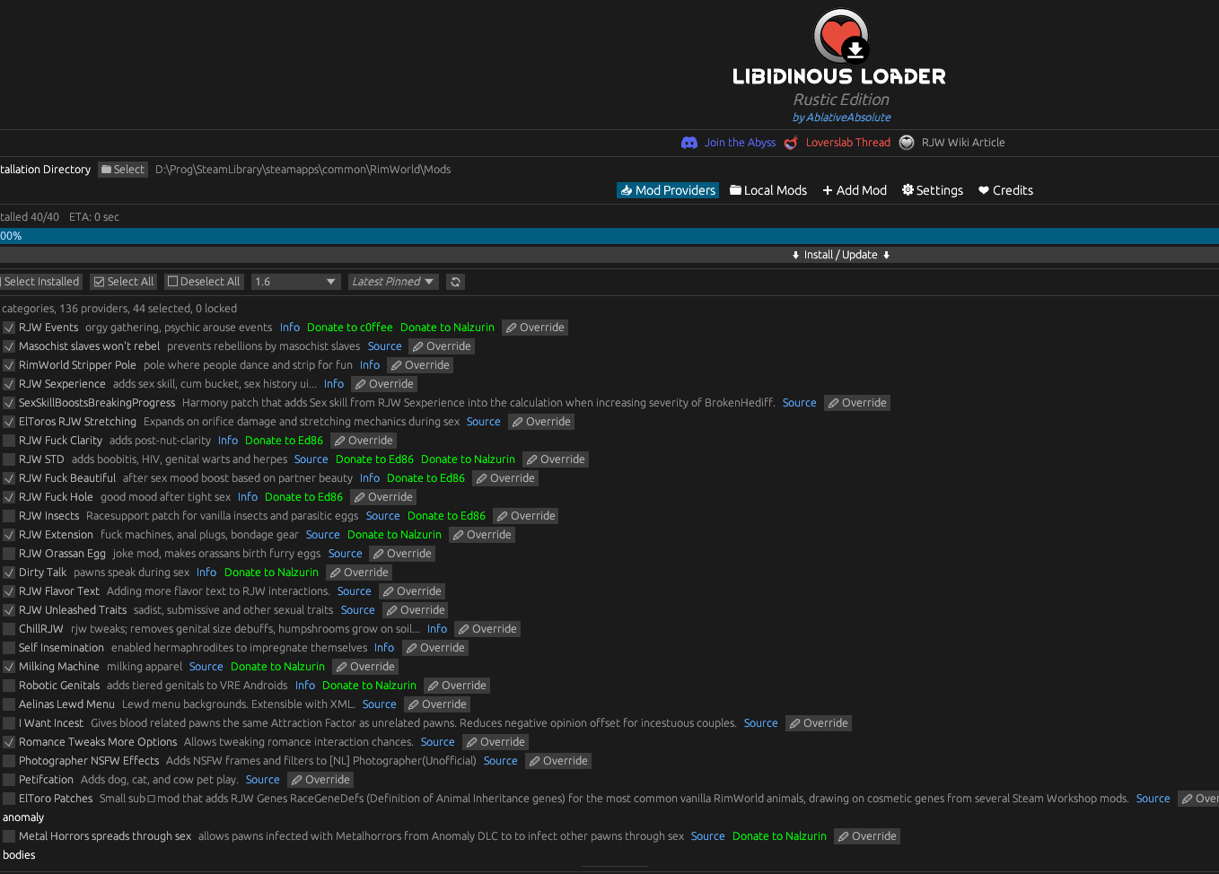 >>50401587 Ну, Кенши это такая штука, где лучше всего отыгрывается в голове. Что-то вроде Муравинта на максималках в этом роде. Есть два стула: 1) ставишь производительность и QoL моды, всякую мелочь типа расширенных лимитов в сундуках, говорящих гаттеров, изменение скорости прокачки (прямое х3 или х5 не советую тк теряется чувство прогрессии, была где-то версия с нелинейной зависимостью) и потом отыгрываешь сам свои цели. Жертва каннибалов без ноги, корован хайверов, бродячий древний скелетон-ронин, феминистки-террористки на границе со Святошами, Третья Империя которая сама построила кучу новых городов... 2) берёшься за крупные моды но будучи готовым к тому что там много васяноговна и/или что-то не работает как по отдельности так и между модами. Новые оружия, анимации атаки, новые расы, тех деревья и производственные цепочки для аутаостов, новые здания (или разрешение на постройку имеющихся зданий).