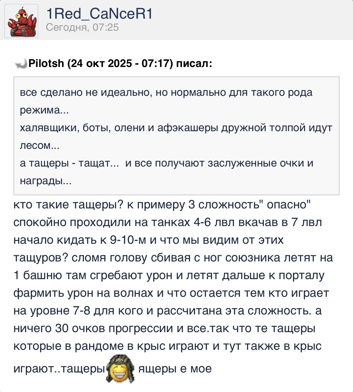 Не, нахуй. Я пиздец как люблю пве режимы всякие, но тут признаю - дикая духота. Я бы хотел покатать всяких дедов с минами, хуйню с чёрной дырой, но просто как представлю что опять с нуля из качать мне хуево становится. Лучше бы сделали прокачку в бою, как в стальном охотнике. А так ебал эту парашу, буду как все урагана качать >>50359588 Так я про это и пишу