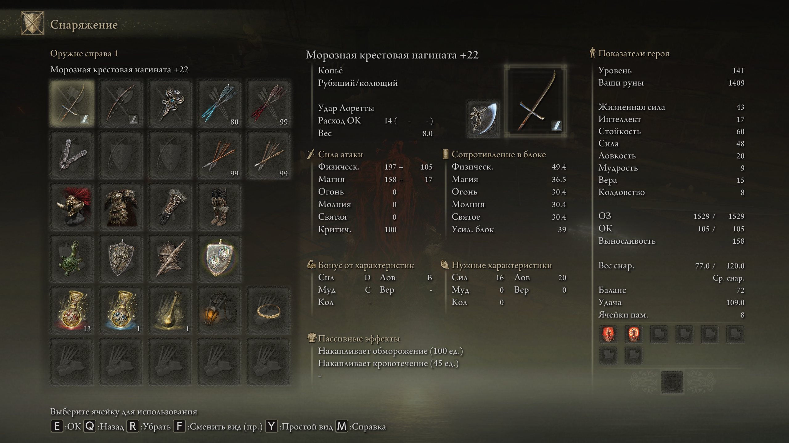 >>50397668 Билд говна а вот по уровням перекач, гугли про софткапы и хардкапы. Половина твоих "боссов" рядовые мобы кстати. Ещё смотри на буквы в бонусах характеристик оружия, чем ближе к А тем больший бонус к урону, а выше А только S. Руны не нужны потому что на них тратятся дуги а их ограниченное колличество, штук 50 на всю игру вроде, действуют до смерти, самая полезная руна годрика на плюс к характеристикам
