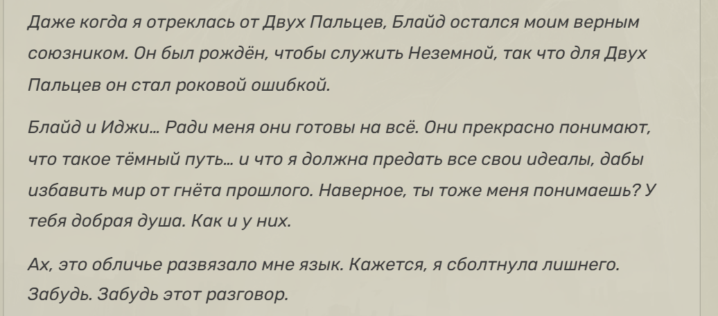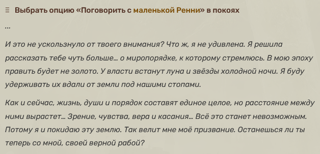 >>50442943 Я тебе даже больше скажу, это еще и на концовку повлияет. Вместо: >Well then. Shall we? My fair consort, eternal. Будет: >Let us go, together. My dear consort, eternal.