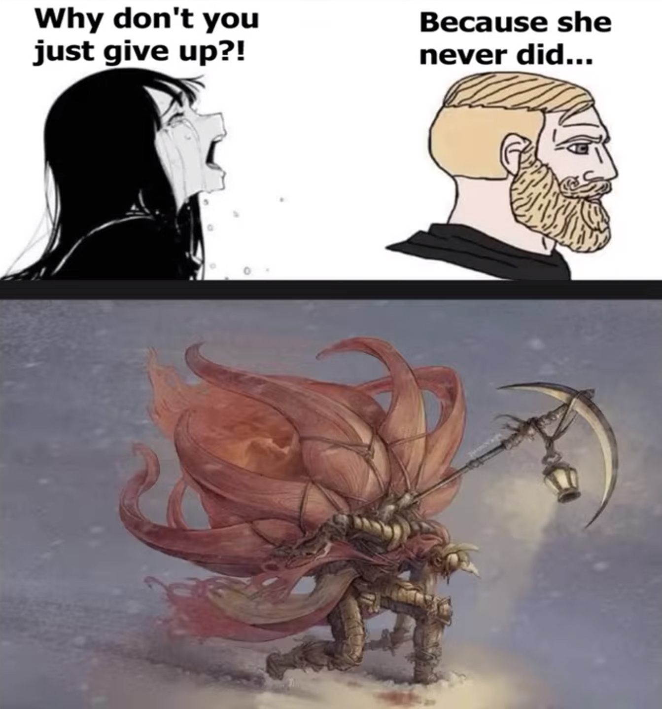>>50443777 Ромина ведь не всегда была сороконожкой... Она - один из немногих выживших роговестов, чей храм сжёг дотла Мессмер и его армия. И уже после этого она каким-то образом подцепила гниль и сделала её своим оружием. Так что, её агрессия, скорее всего, вызвана жаждой мести и желанием защитить священную для всякого роговеста башню от любых вторженцев.