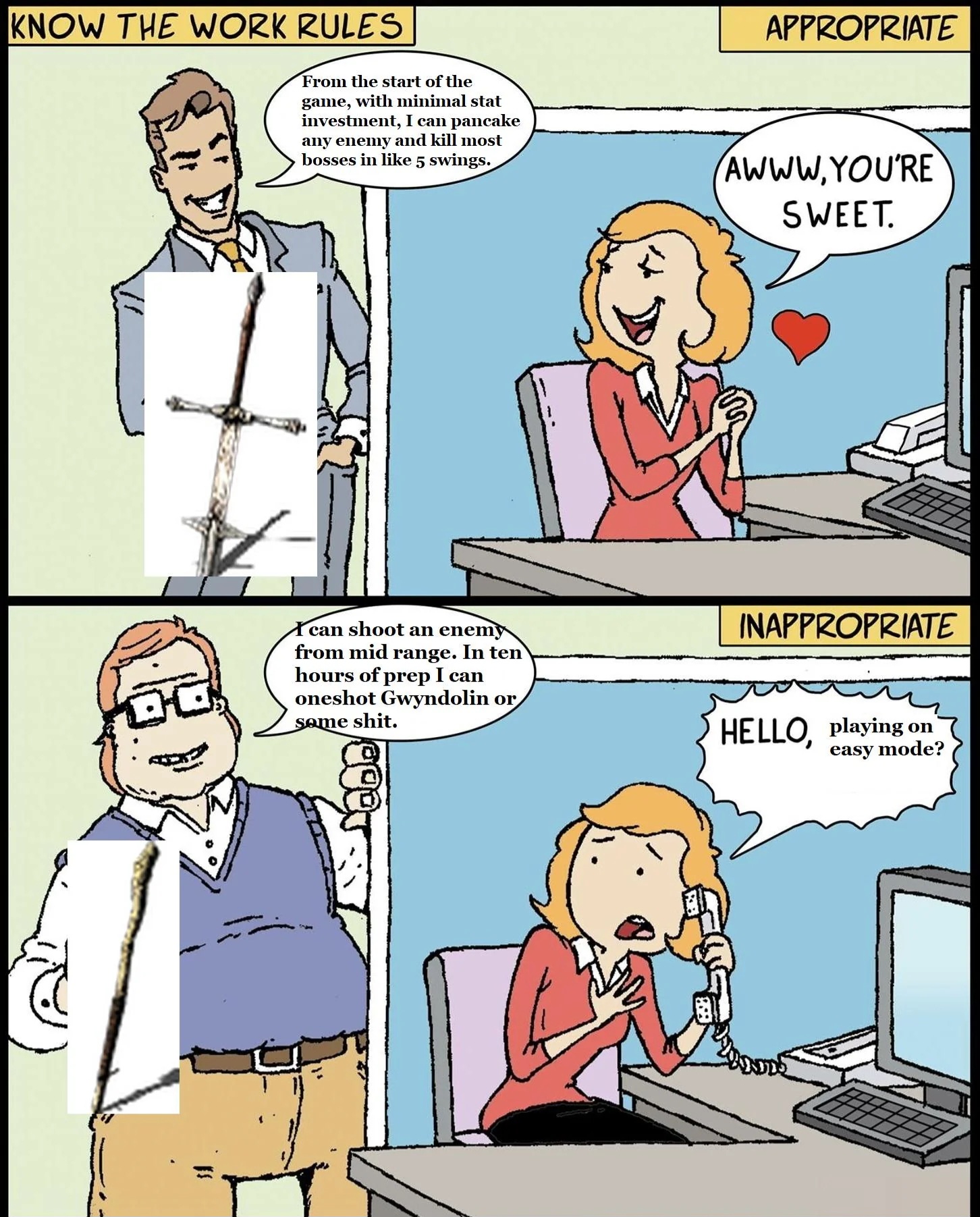 >>50457201 >тогда как души даже в первое прохождение с этим не справляются Ой, иди нахуй. Делай скидку на возраст, хуепутало. После елдарика конечно игра будет выглядеть как какой-нибудь марио для казуалов. А тогда все ссались и рейджили, превозмогали и надрачивали себе в ротешь только от того что смогли забить чОрного рыцаря в андедбурге.