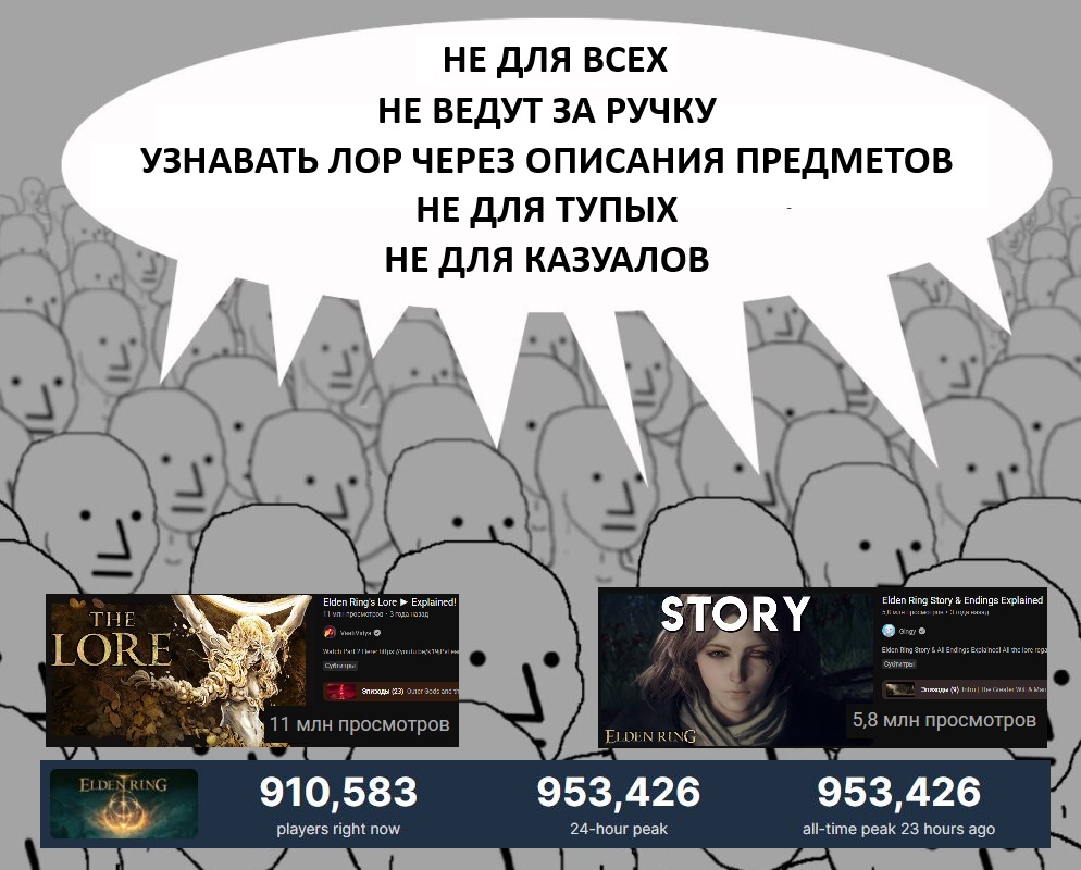 >>50457148 Так а к чему тогда претензии к элдену, если соулсы с нулевой секунды своего существования это перехайпанная параша для нормисов? >абсолютно никакого вызова не представляет уже на втором ране. Пффф, можно ли было спиздануть что-либо более нелепое? Эниуей, в чем претензии к стримеркам с ковриками, я так и не понял. Сам ты так не можешь очевидно, ну а тот факт о том что так многие делают должен говорить о чем? Что игра типо лёгкая? Ну так забросить можно что угодно, это не значит что это легко как бы. Ну и полно я думаю прохождений с ковриками боссов из дс. Да, может меньше чем к элде но только потому что элда популярнее. Почему популярнее? Потому что лучше во всем, очевидно. А вот ты зачем-то путаешь причину и следствие. Не то чтобы меня удивляло твое невежество, конечно. Короче очередное идиотское мнение в стиле популярно значит плохо лол