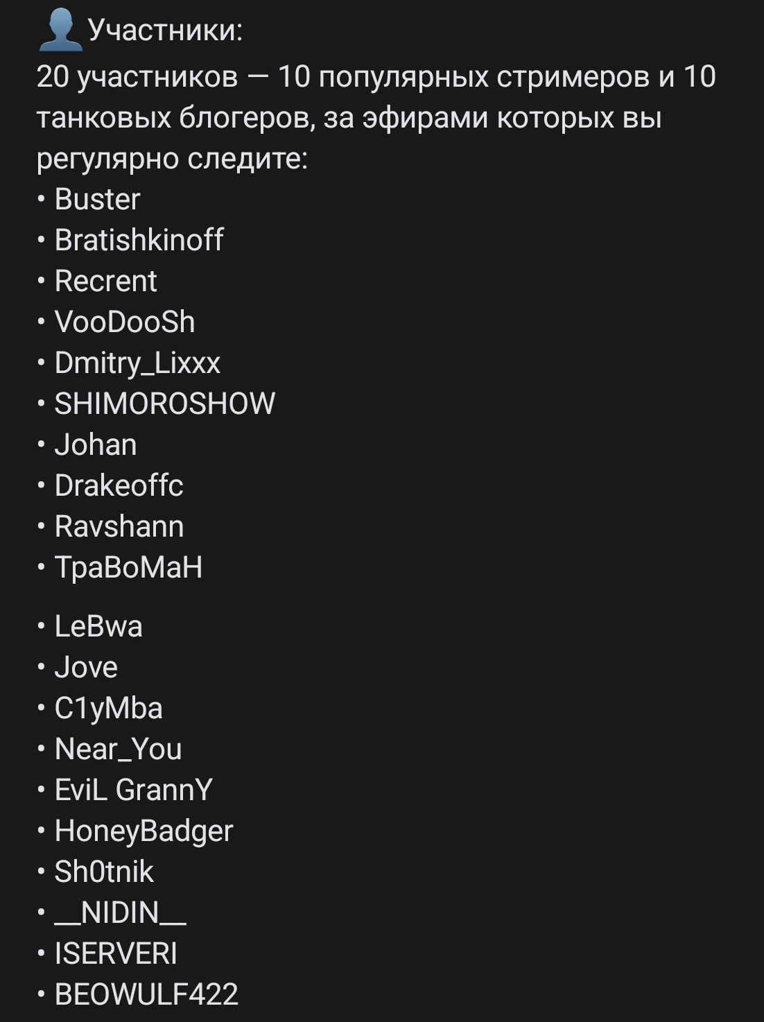 >>50374235 А есть какой-то список этих ваших танкоблохеров, что и кого лучше смотреть? Залетел щас после очень долгого перерыва, понимаю что я полный рак, не знаю половины карт и танков.