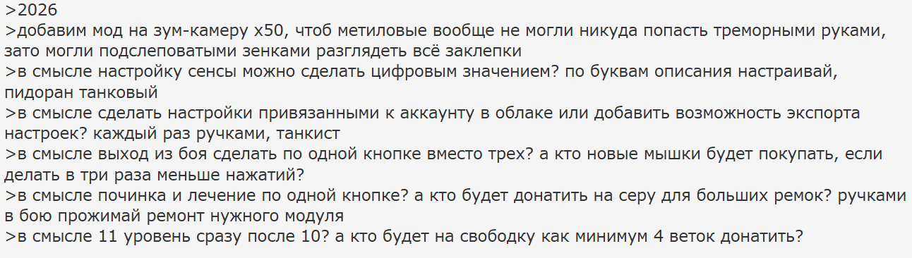 Доколе мы будем кататься на старых проперженных танках времен Второй мировой? Чому бы не выпустить тутлы, начиная с холодной войны? Заебали уже деды эти. Хочется на т. 80 поебашиться.