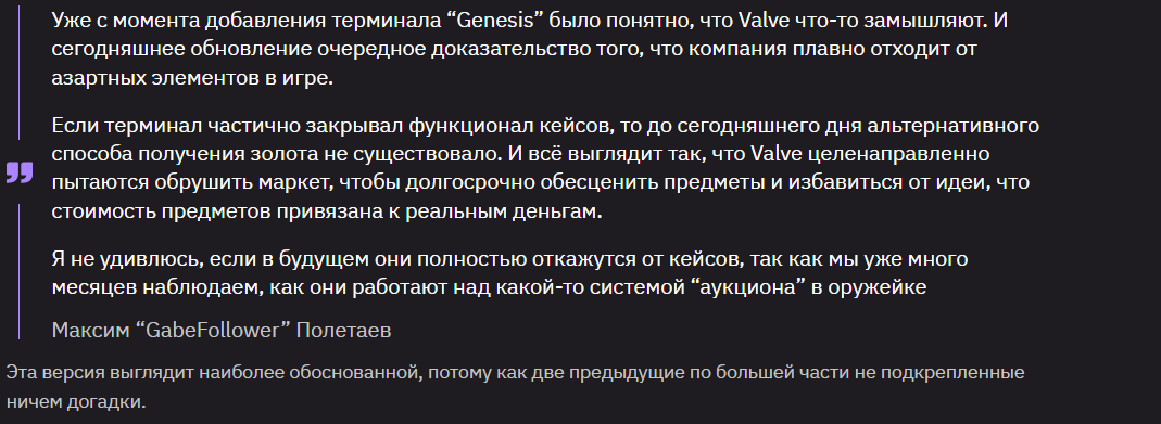 1. До нуля точно не обесцениться. Гейбу важно, чтобы все сделки проводились в стиме, и чтобы не было предметов дороже порога максимального баланса, это 1500 долларов. 2. Идет привязка к стиму, эти арморы, батлпассы, кейсы. Терминал это реальный признак того, что кейсы могут уйти на второй план. Это и из-за законодательства по азартным играм. 3. Трейд в доте был уничтожен. В 2014-2015 люди продавали вещи в кс, чтобы купить что-то в доте.
