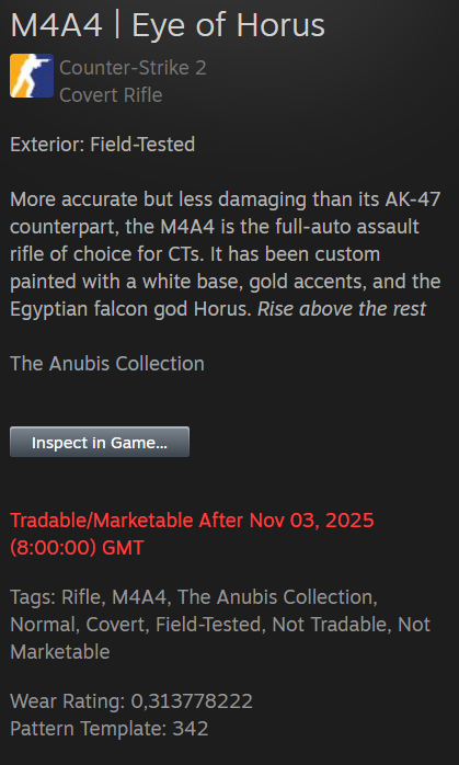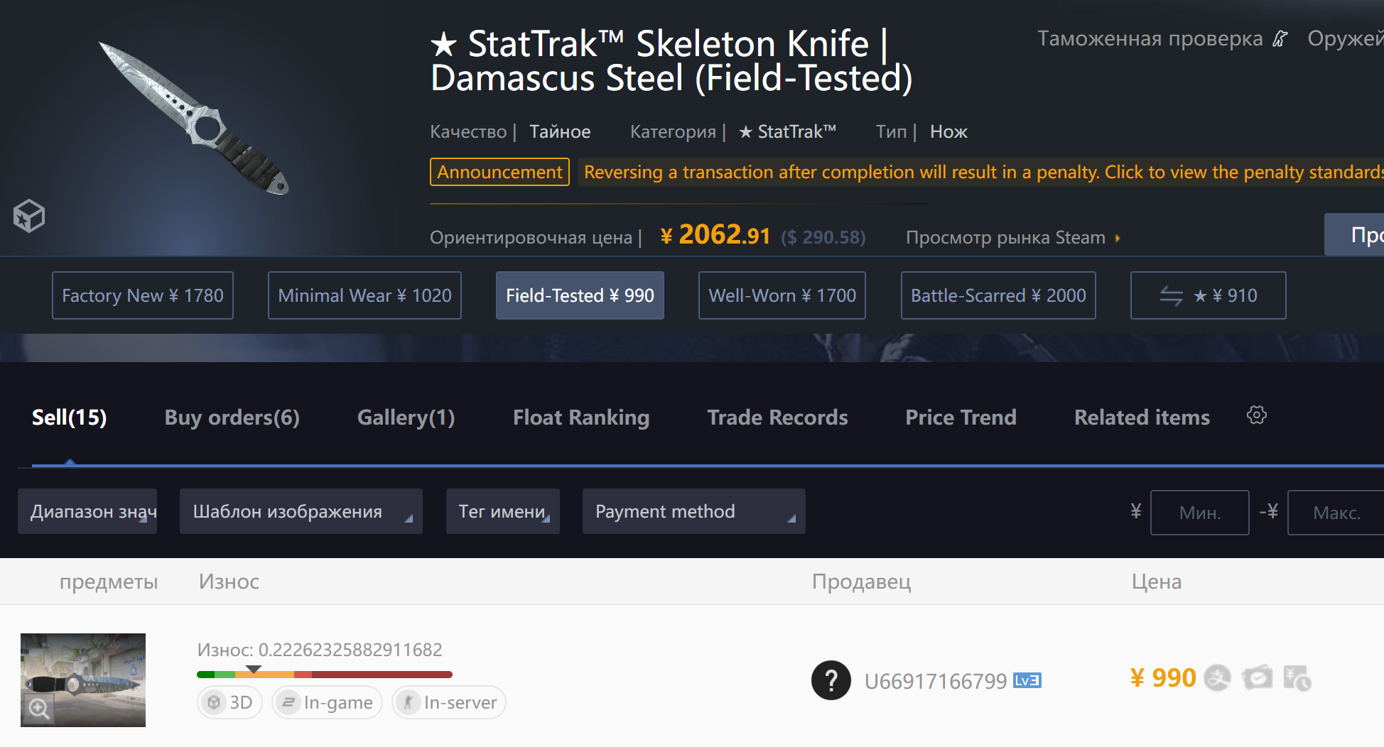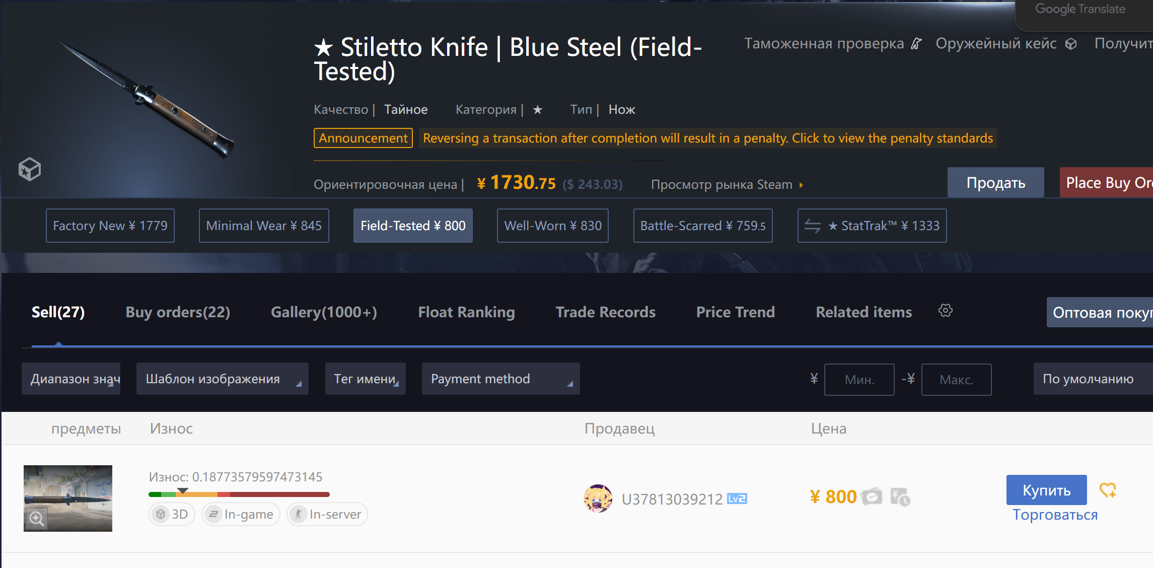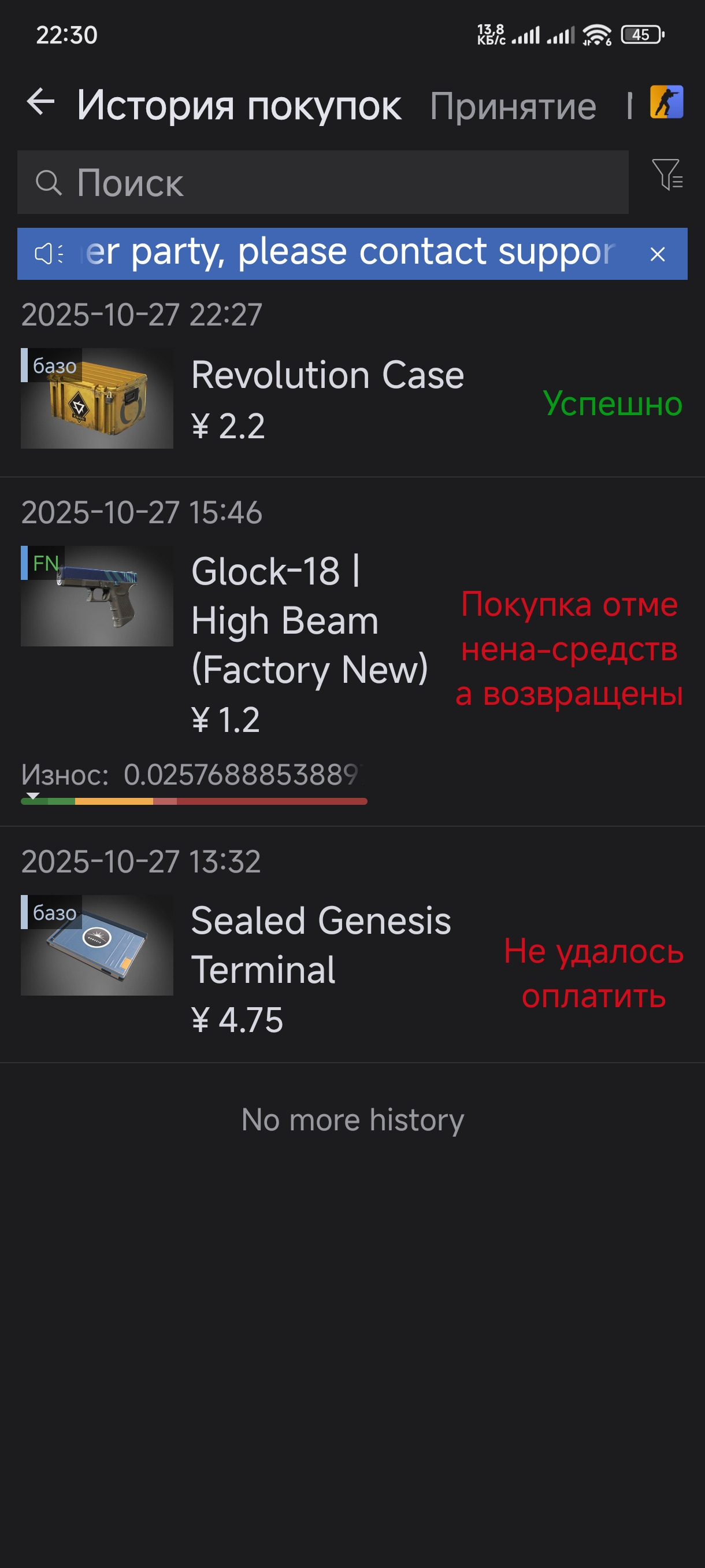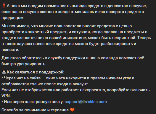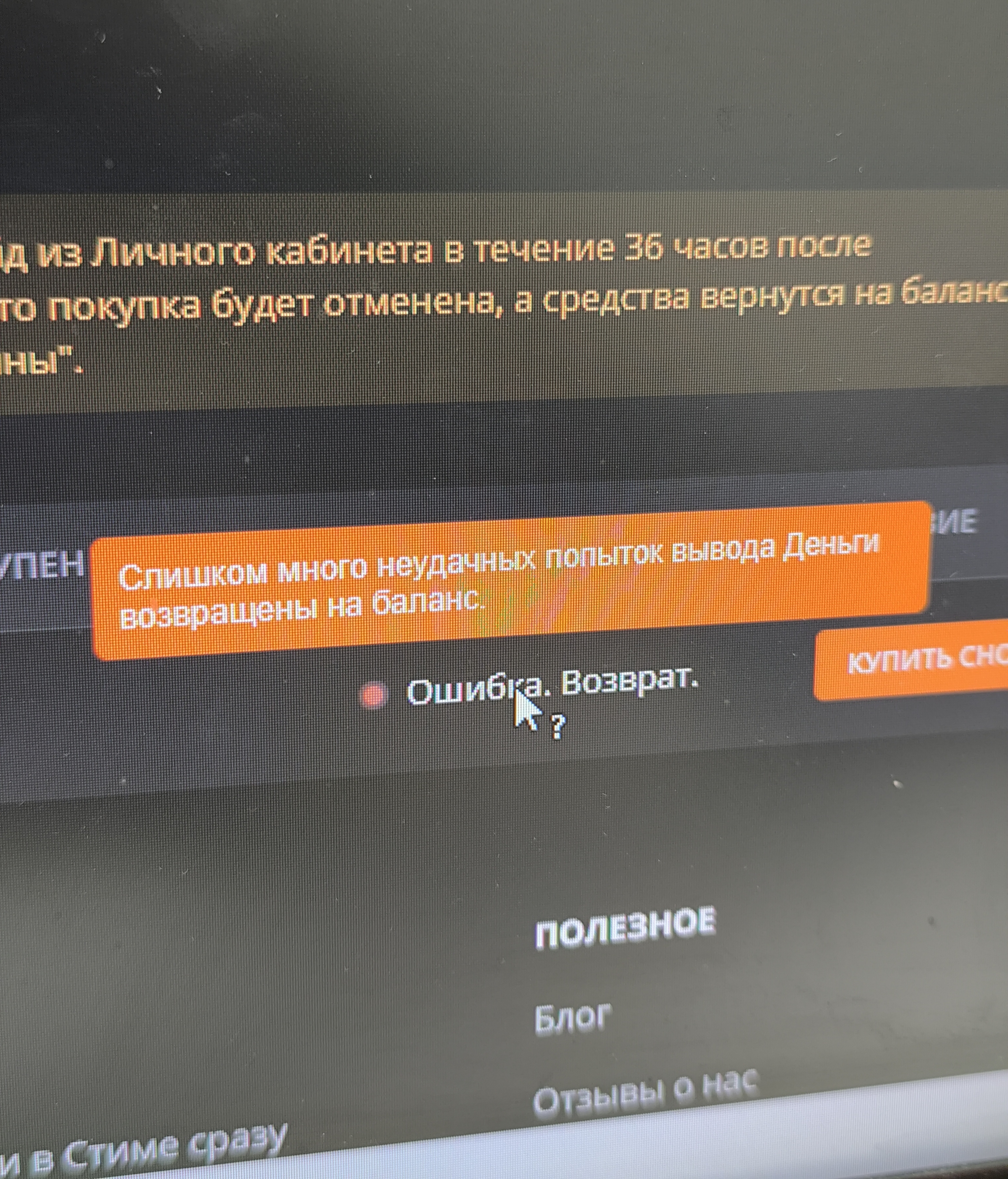 Данный скин находился в холде, после чего юзер, который нам его продал, сделал trade reverse. Вследствие этого сделка аннулирована. Средства зачислены на ваш баланс, просим прощения за предоставленные неудобства. Ладно анон был прав