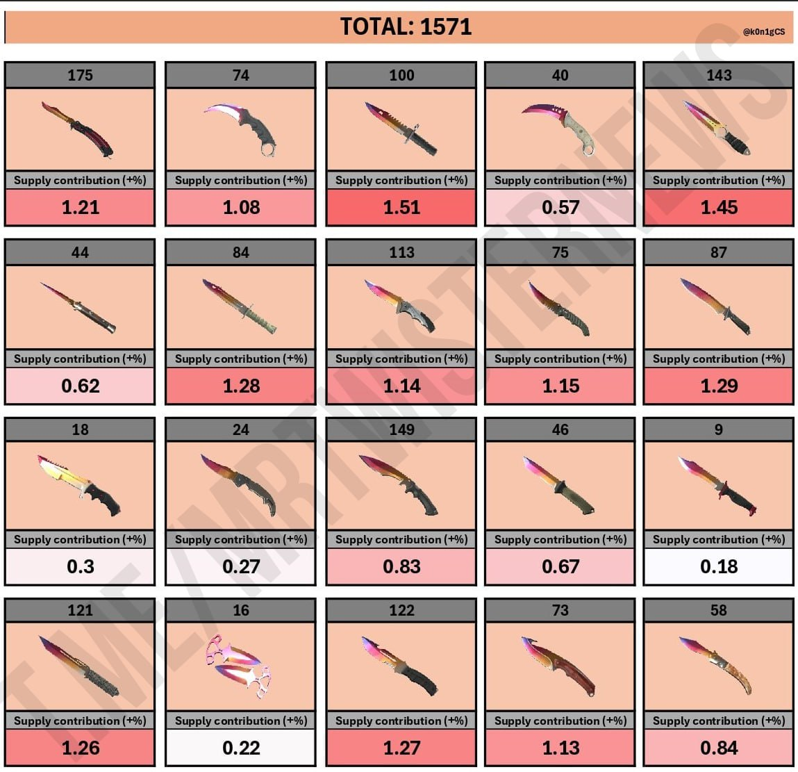 Сегодня 26 октбяря было открыто 3086195 В игре появилось примерно 7715 ножей, еще в игре пояивлось примерно 20к новых красных предметов которые будут сконвертированы в 4к новых ножей. И того более 10к новых ножей из ничего, завтра еще 10к, послезавтра еще 10к.