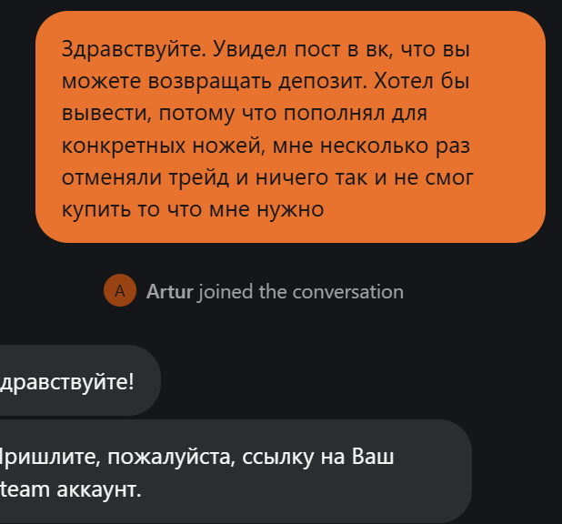 >>50371524 Могут не отправить трейд, деньги вернут через час~ Могут отправить трейд, и через несколько дней вернуть обмен, думаю бабки тоже вернут но хз когда, не сталкивался