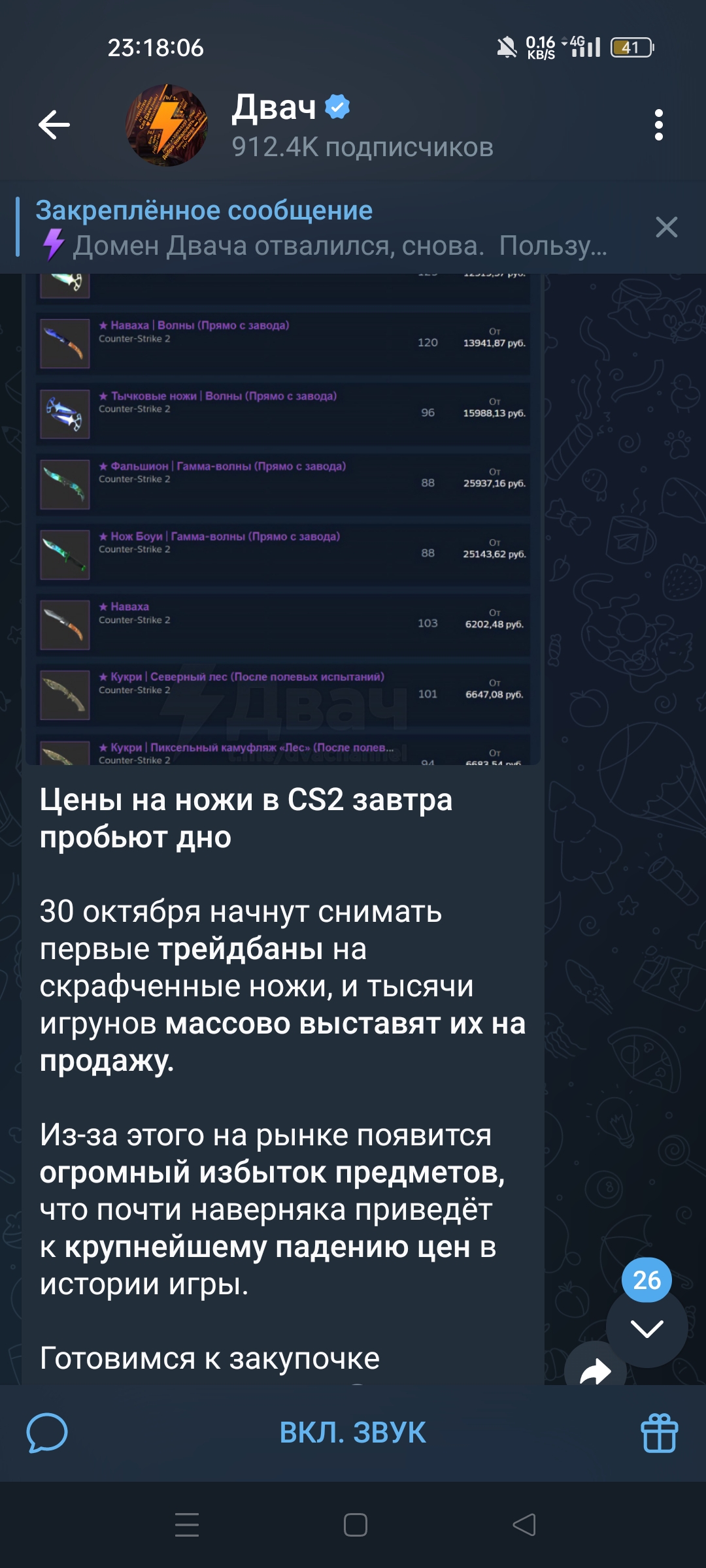 ну че как закупились ножами? я хуею с логики этого рынка красное взлетело в космос - так и осталось казалось бы ну ножей больше стало, они должны подешеветь но нет блять)) в итоге и красное такой овер стоит, что щас крафтить это пиздец какой риск и ножей нема