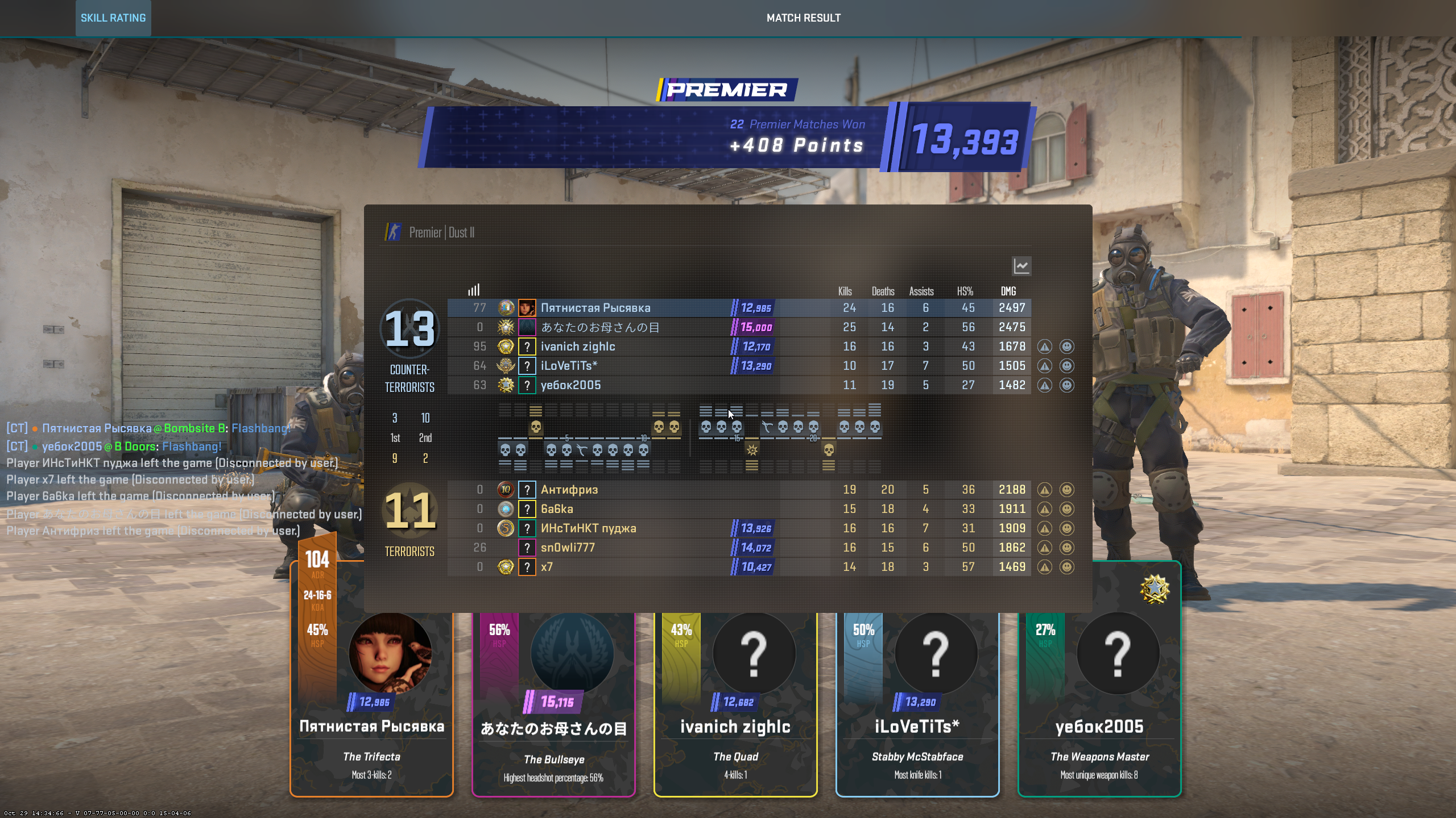 найс камыч никто за Т не умеет на даунских синих рангах лол после 1-9 уже все сдались, молчим берем 2 еще. и 2 за кт, тип такой голос подал "чето молчите, где инфа" я говорю дак мы сосем, дизмораль он говорит не нихуя, мы выигрываем и все пошла жара
