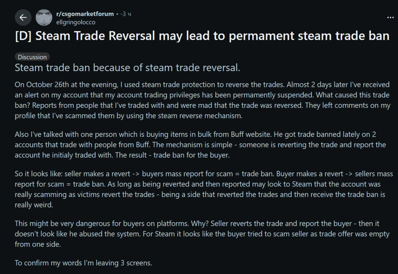 Автор поста пишет: "Вечером 26 октября я воспользовался защитой Steam для отмены сделок. Почти через два дня я получил уведомление на свой аккаунт о том, что я получил трейдбан навсегда. Что стало причиной? Люди, с которыми я торговал и которые были возмущены отменой сделки, оставили комментарии в моём профиле, что я их обманул, воспользовавшись механизмом обратной сделки Steam."