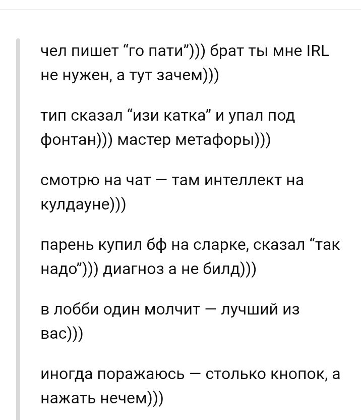 Если ты чмоха которая не кайфует от самого процесса и от того как ты отиграл некст катку лучше чем предыдущую, то какой смысл ваще играть? Будешь очередным чсв хуесосом который играет по скилу на 1к, и горит с того что тиммейты играют не так как ты себе вообразил))