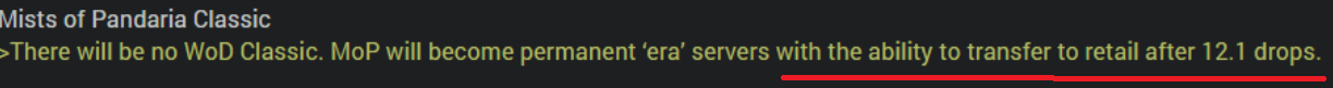 Я вот не вижу смысла в Дреноре / Легионе и т.д. Классике. Это всё хуйня, рано или поздно ведь будет Шедоулендс классик, а это мем ебаный вообще. А лет через 10 классики догонят по прогрессу основные сервера и будет 2 одинаковых вова.
