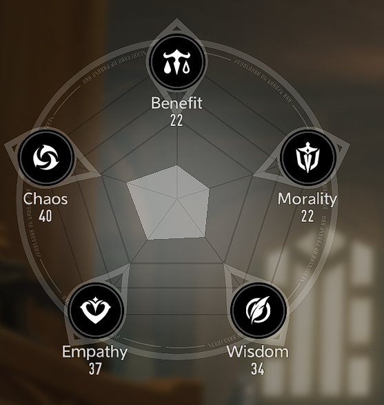 бля единственное что меня сейчас беспокоит, то что я отвечаю в диалогах по приколу, но уже заметил, что прокачиваются характеристики типа МУДРОСТЬ ЭМПАТИЯ ХАОС и они уже используются в других моментах, например эмпатия давала бонус к броску кубиков что если я запорол прокачку своими рофловыборами, бля сложно