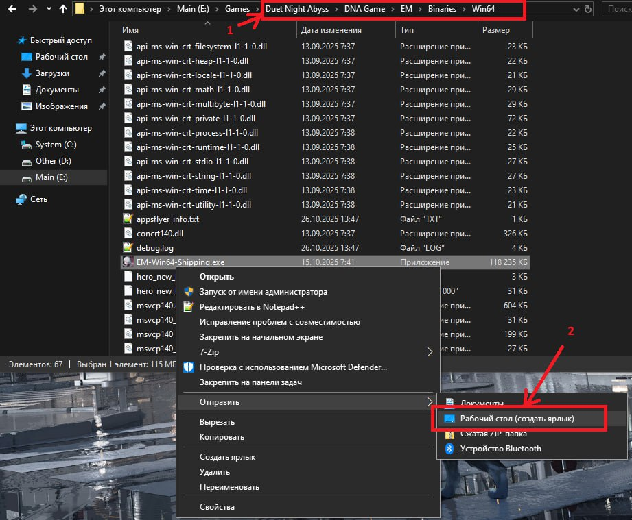 2. Добавление -fileopenlog: 2.1 Перейдите в папку «Duet Night Abyss\DNA Game\EM\Binaries\Win64». 2.2 Создайте ярлык файла «EM-Win64-Shipping.exe», как показано на первом скриншоте. 2.3 Откройте свойства ярлыка. 2.4 В строке «Объект», в самом конце добавьте «-fileopenlog», как показано на третьем скриншоте.