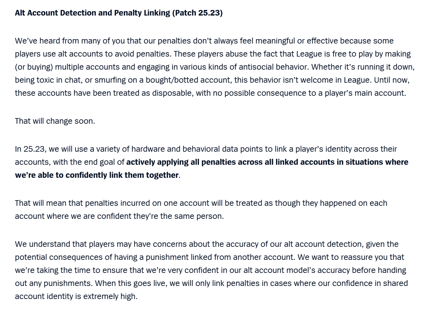 если риоты свяжут все аккаунты одного игрока вместе они могут просто запретить смурфинг по факту все твои альты просто получат такой же ммр в нормалах, а в ранкедах тебя кинут в смурф очередь и заставят тащить чтобы норм смурфить нужно будет с другого компа через впн играть и регулярно очищать все данные вангуарда и прочих ритовских шпионских приложений