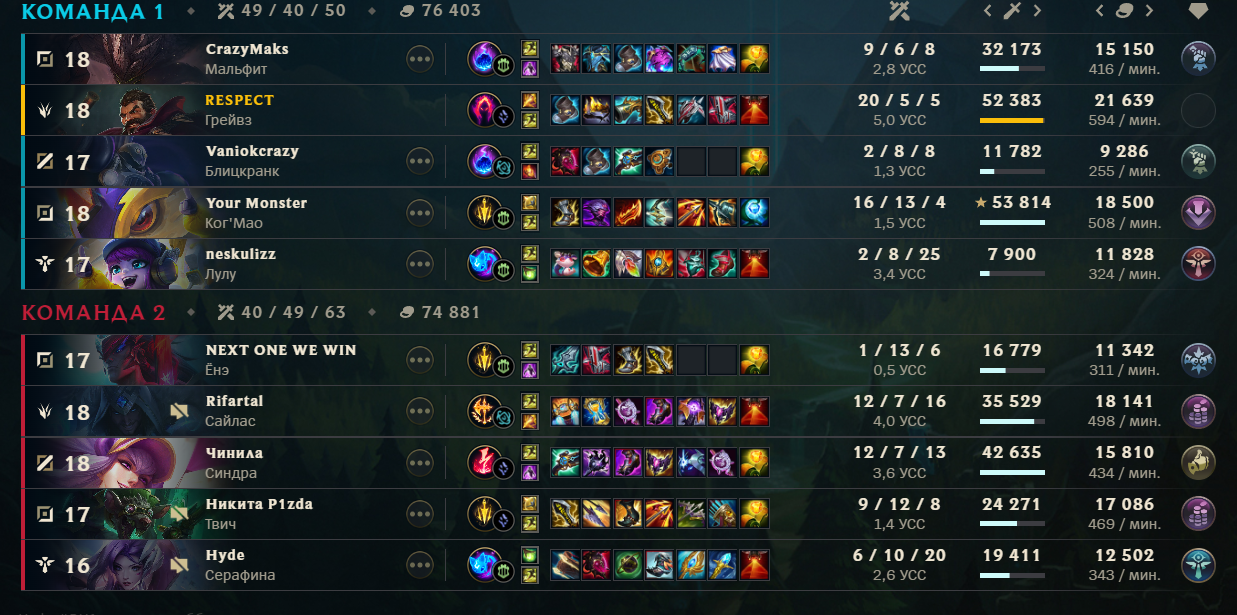 Бтв самым ебаном пиком который я видел, мы таки выиграли. Мидовый сион разбайтил топера на пик дариуса, и по итогу фронтлайна для двух адкалов хватало. А лесной автофилл вдонатил талии даблбаф, ебать кайф было против этого лайнить.