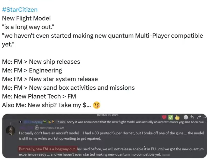 Короч я понял на примере инженерки, что угрожает ситизену как уникальному и глубокому проекту больше всего. Это не затянутые сроки разработки. Не то, что это скам ради скама. Игроки. Вот что по-настоящему убьет ситизен. Постоянно ноющие и визгливые, по первому слову которых цыги срочно вырезают механики и с горящей жопой оказуаливают глубокие системы взаимодействия с миром, на которые было потрачено так много времени. Я так думаю, что из-за ебанатиков которым "дущна", любой аспект игры, который хоть как-то пытается пойти в глубь, в будущем столкнется с преградой из соевых плакальщиков, которые купили капитальный корабль за реал и хотят летать на нем в соло, в упор игнорируя при покупке надпись "мультиэкипаж". Циги очень податливы и сговорчивы, это их и сильная и в то же время слабая сторона. Проблема в том, что они полностью финансово зависимы от этих нытиков и пока будут идти у них на поводу. Скорее всего к релизу инженерка окончательно превратится в нонфакторную фичу, а не основу для управления кораблем. Обидно.