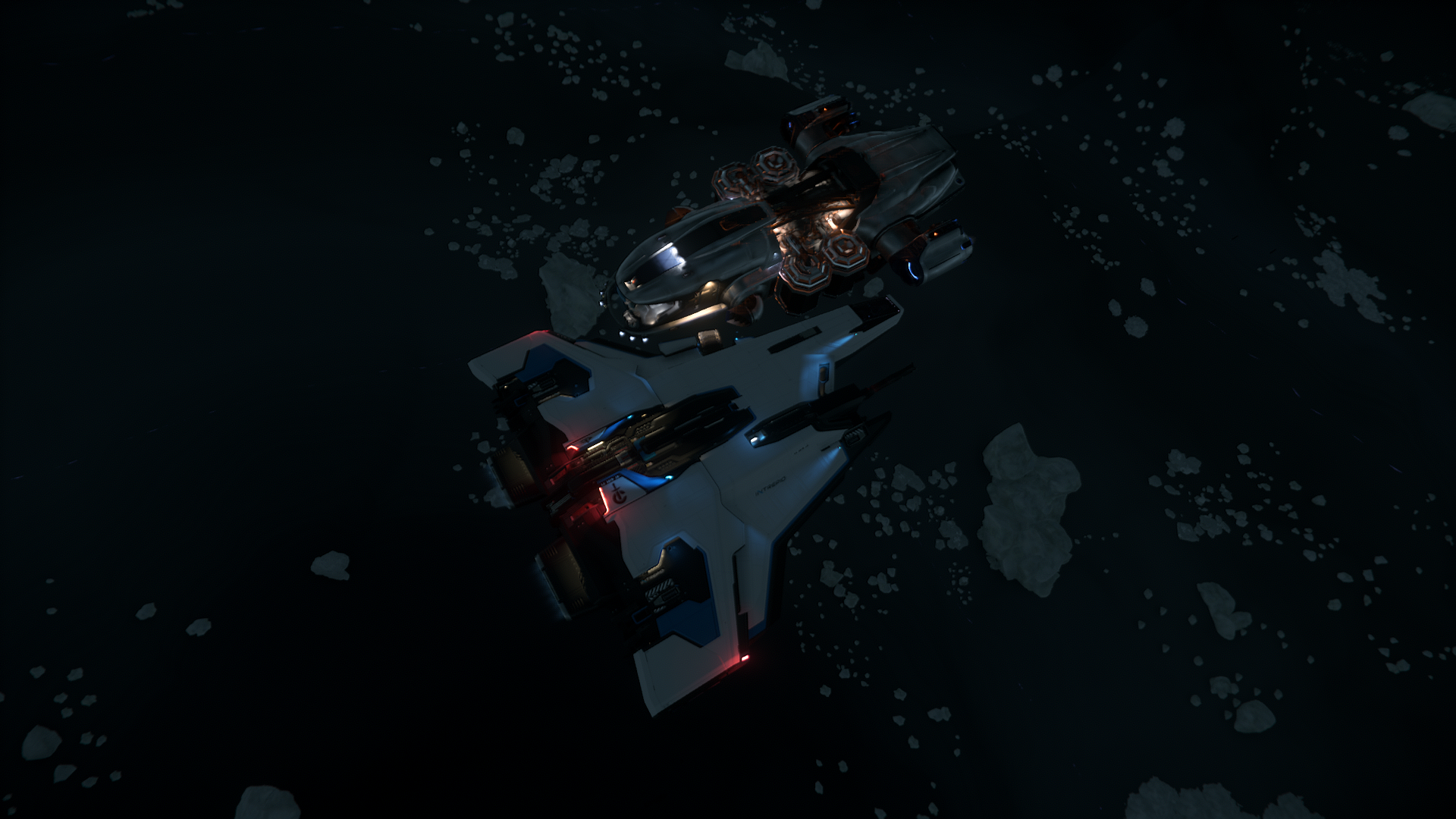 Разлогинился я, значить прям посреди майнинг рана. Очнулся на станции, гляжу - а корабли не ПОТИРЯЛСИ, а всё так же висит над луной и маркером мне подмигивает. А там бур хороший нацеплен, а там золотой руды почти пол-трюма. Ну делать нечего, надо забирать, раз такая удача случилась. Но как оказалось всё не так просто, он на высоте 300 метров висел. Хорошо хоть внешняя камера есть и трап длинный. 5 секунд хватило, чтобы не задохнувшись его на абордаж взять.
