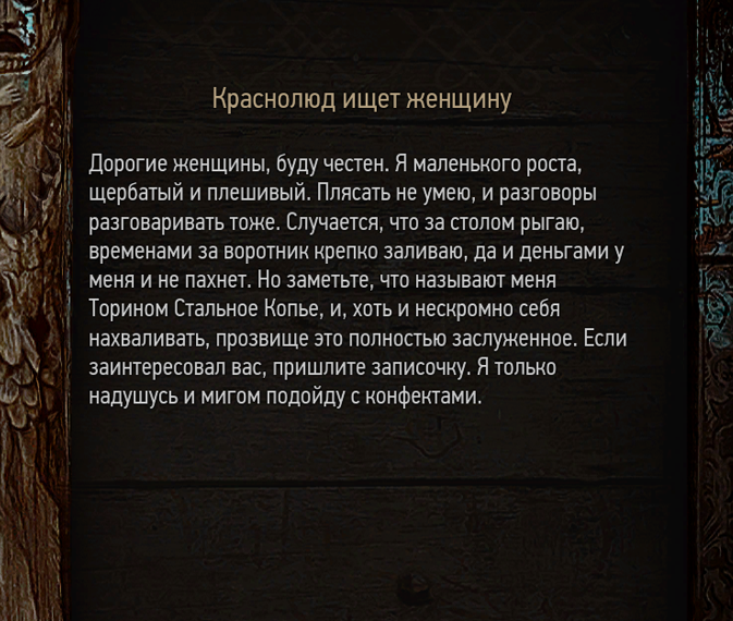 >>50405765 >И тут он внезапно.. охотится на лешего для старухи? Бегает за оборотнями? Было в книгах, только там этому было уделено пару строк. Точно помню, что там ещё был момент с оборотнем, который сам сдался и дал отрубить себе голову, обычно Гервант бы его пожалел, но ему нужны были деньги на поиски Цири. >Решил зайти в барбершоп и сделать новую причу? Никогда не делал себе причу, а побриться - ну так бля, неухоженная борода мешает есть и пить, а к брадобрею сходить это сколько, ну 30 минут раз в неделю потратить? >Плавает по ебеням в поисках чертежей для ведьмачьей брони и мечей? Ну представим, что когда охотился на оборотня ему чуть ногу не отгрызли, а тут прошла инфа о том, что есть чертёж снаряги получше + понятно, что придётся ебашиться за Цири с Охотой, нужно быть во всеоружии.