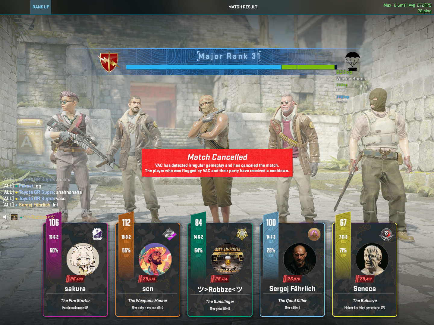 А теперь смотри, что происходит: я выхожу играть, не читерю, просто делаю то, что умею, и меня начинают заливать репортами каждый божий раунд. Потому что для местных лузеров, которые не могут контрстрейф выучить за год, любой, кто попадает в голову больше двух раз за пол-игры — уже читак. И система, вместо того чтобы разбираться, тупо кидает меня в помойку с этими самыми читаками.