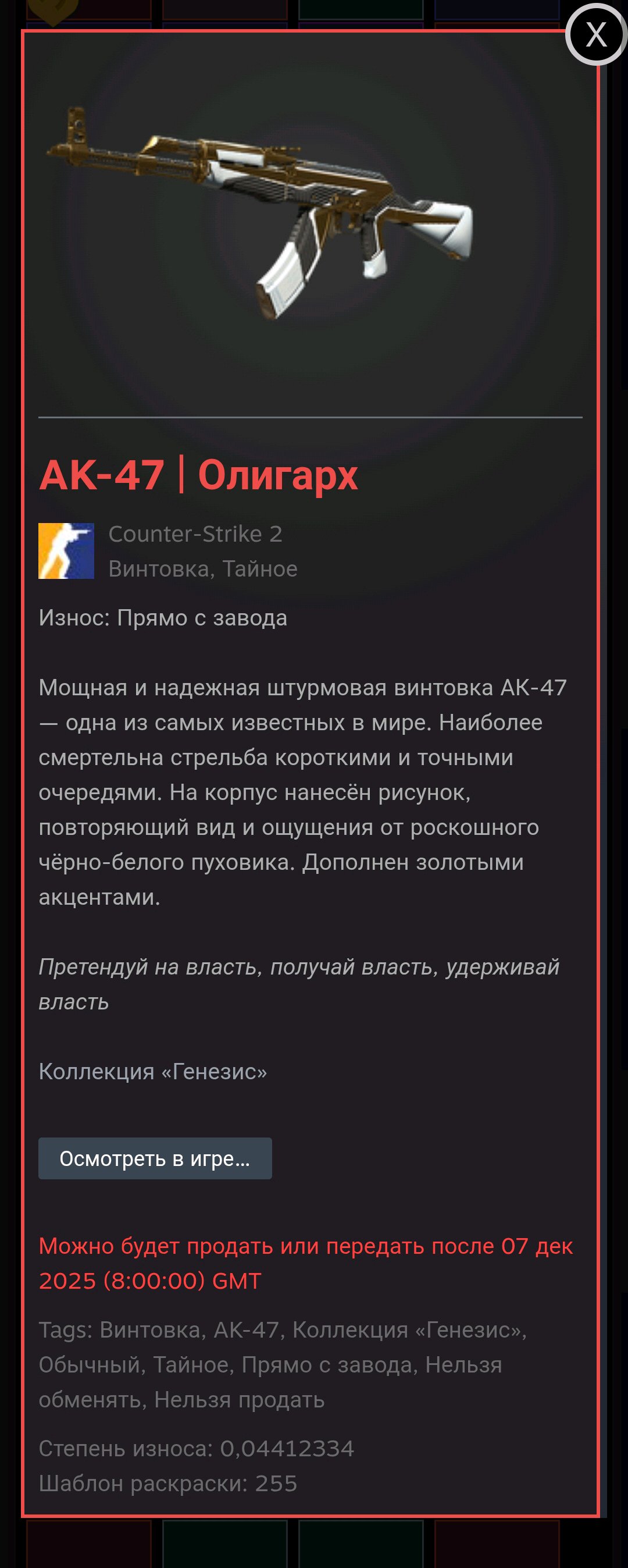 Всё, блядь, done. Пришлось, сука, за float переплатить три тыщи, по 50к были, но там дефолтные 0.06 и на олигархе это хорошо видно, прям такие белые царапинки, тут же почти идеально. 53к отвалил