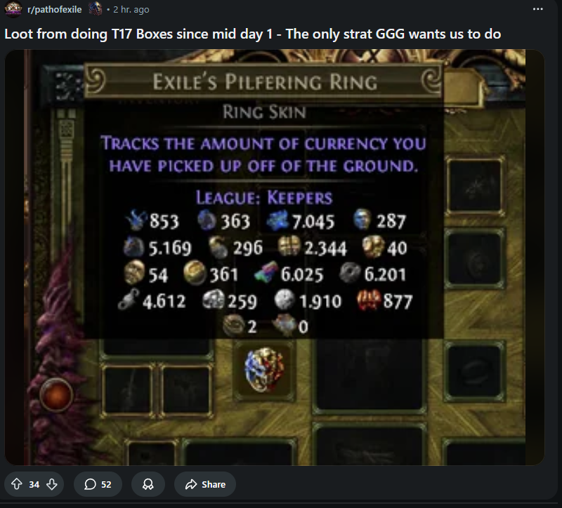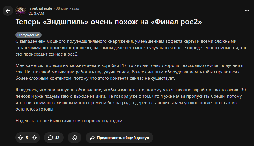 Забыл добавить, что новый трейд - это пиздец. Требовать голду для всего, когда нет человеческой системы её получения - это пиздец. Голда есть только на мапах (ещё вроде в хейсте), а если ты не хочешь их бегать, то ты ничего не купишь. За некоторые уники и рамки нужно платить по 20к+ за трейд, это же просто сумасшествие. Даже в ебучем пое 2 можно продавать шмотки за голду вендеру. Просто добавьте это, или чтоб с боссов падало хотя-бы 20к голды, или ещё куча вариантов, убрать нахер эту комиссию, в ней нет никакого смысла. Плюс, оно ещё забагованное и кривоватое. Зачем-то блок на изменение цены и запрет на доставать шмотки, иногда её вообще во вкладку нельзя положить, и многое другое. Не понимаю эту манию, запихать везде требование по голде, но не добавить нормальные способы её генерации.