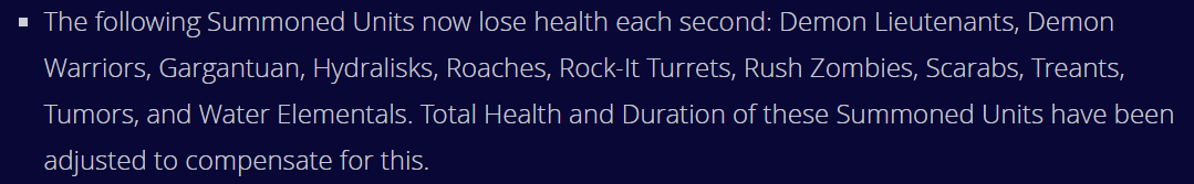 >The following Summoned Units now lose health each second: Demon Lieutenants, Demon Warriors, Gargantuan, Hydralisks, Roaches, Rock-It Turrets, Rush Zombies, Scarabs, Treants, Tumors, and Water Elementals. неосиляторы не могли убить мньенов и теперь им еще меньше жить ойбля сферу нерфанули азме, но могли бы луч апнуть квест ромке-прыгуну на мурке канешно никто не будет делать ибо надо быть отбитым чтобы не отойти/слить рыбу остальное приемлимо