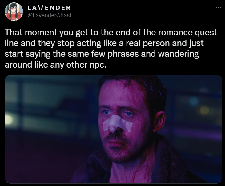 >>50482949 Пара десятков фраз - это будет эрзац, типа "романса" с Элани в НВН2. Даже в Пое2 у персонажей гораздо больше пары десятков фраз, а ведь персонаж не один.