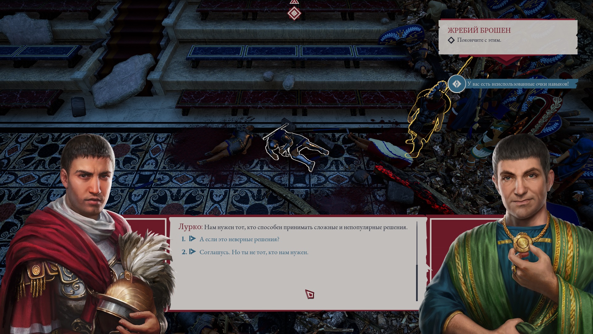 А вот варианты за Республику прям тупые. Они слабо проработанные. И я то ожидал будут прения, интриги, прям Батиата из Спартака. А там унылый диалог, от которого вообще ничего не зависит. Унылая миниигра - потуши виллу. Очень потный бой с челом который бегает в инвизе и имеет +100 к уклонениям. Куколдсимулятор - где Лурко убивает друга, а мы смотрим. А финал - фактически как у императора, только любимый консул.