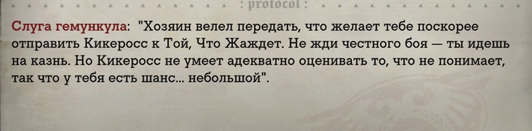 Я ГОРДИУС ФОН ВАЛАНЦИУС ПРЕЕМНИК ТЕОДОРЫ ФОН ВАЛАНЦИУС И СЕРЫЙ КАРДИНАЛ ПРОСТОРА КОРОНУС ОБЬЯВЛЯЮ О НАЧАЛЕ КРЕСТОВОГО ПОХОДА @ ВЛАСТЬЮ ПАТЕНТА ДАРОВАННЫМ НАВЕКИ ЛЮБИМЫМ И ПОЧИТАЕМЫМ ИМПЕРАТОРОМ ЧЕЛОВЕЧЕСТВА ПРИЗЫВАЮ СВЯТЫЕ ВОИНСТВА ДЛЯ БОРЬБЫ С КСЕНОУГРОЗОЙ И АРХИВРАГОМ @ СЕРДЦЕМ ПОХОДА ОБЬЯВЛЯЮ СВОЙ КОРАБЛЬ ЖЕСТОКИЙ ОТЕЦ @ ЛЮБОЕ ПРЕПЯТСТВИЕ ДЕЛУ ТКАЧЕЙ БУДЕТ РАСЦЕНИВАТЬСЯ КАК ЕРЕСЬ @ ИМПЕРАТОР ЗАЩИЩАЕТ