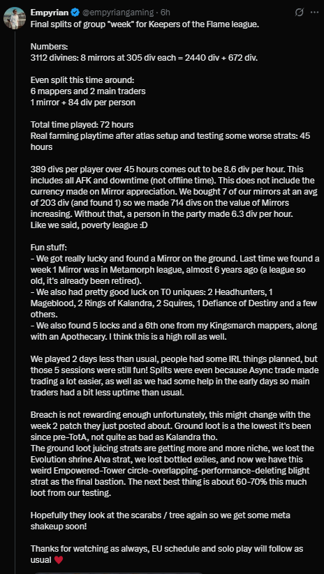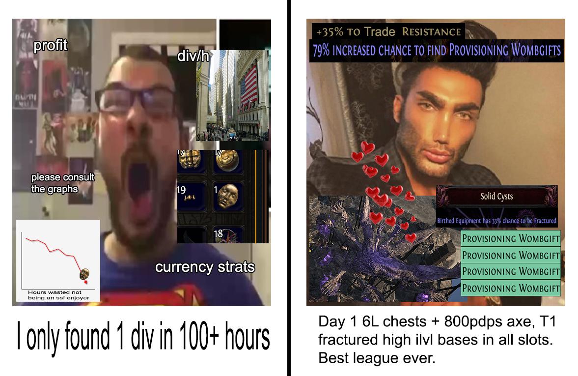 да лига неплохая дерево рарками кормит но всем нужны не рарки и билды а что б была имба страта что бы генерировать по 100 див в час а такой страты пока нет