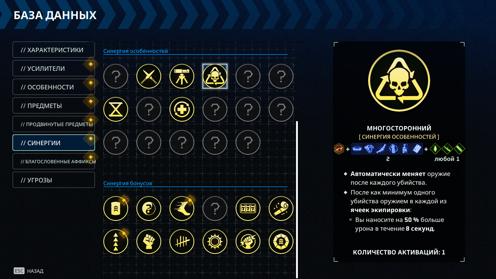 >Хуйня твое определение синергии, это раз. Прям совсем хуйня, не позорься. Ты согласен что изек это игра по синергии? В изеке синергии синергируют тебя в монстра в 99% времени, там нет синергий от условий. >В игре есть отдельная механика, которая называется синергией. Да я в курсе, эта хуита заставляет тебя брать эффектики которые тебе ну нужны, которые мутируют в "синергию", которая прокает от условий. >Синергия в дедзоне работает как эволюция в вампирслайке (почти). Ты берешь несколько абилок по "рецету", когда все абилки взяты, ты получаешь "синергетическую абилку". Которая по сути вообще отдельная абилка. Пример такой абилки "заспавни на месте убитого моба турельку". Пикрил еще пример синергии. А теперь смотрим что дают "синергии" - первая дает по сути постоянный урончик, то есть циферку и меняет оружие активное. Это хуевая синергия. Почему это хуево: циферки и так качаются на оружии, запихивать циферки в синергии это лези ворк рарабов. Не хуевая синергия была бы если бы автосмена оружия давала уникальный эффект которого нет в основном игровом процессе - скажем вот ты убил врага, меняется оружие и дается слоумо, или там например любое оружие становится акимбо, или после смены и убийства ты можешь оба оружия держать одновременно. На второй пикче опять обосранные статки. На третьей статки и О БОЖЕ восполнение магазина, что в нормальном гейдизайне обычно аффикс на оружии. На четвертой просто позор. >Пример такой абилки "заспавни на месте убитого моба турельку". Ну вот это с натягом можно назвать синергией, если спавн честный без отката. >Пикрилы посмотри и подумой. Это альтернатива узкоспециализированным стихийным баффам. Их там дохуя, я не буду тебе каждый бафф расписывать. Да они все статки бустят в основном, это лези ворк разрабов которым лень умишко включать чтобы что-то интересное выдумать. >Сулфур это вообще не про динамичный шутинг. А я в контексте стрельбы говорю. Ты тут ноешь что дедзона это же ШУТАНЧИК и как ШУТАНЧИК он ок, стрелять вкусно в целом, так вот в сулфуре тоже стрелять приятно. Если тебе от игры нужна только стрельба - сулфур тоже подойдет.