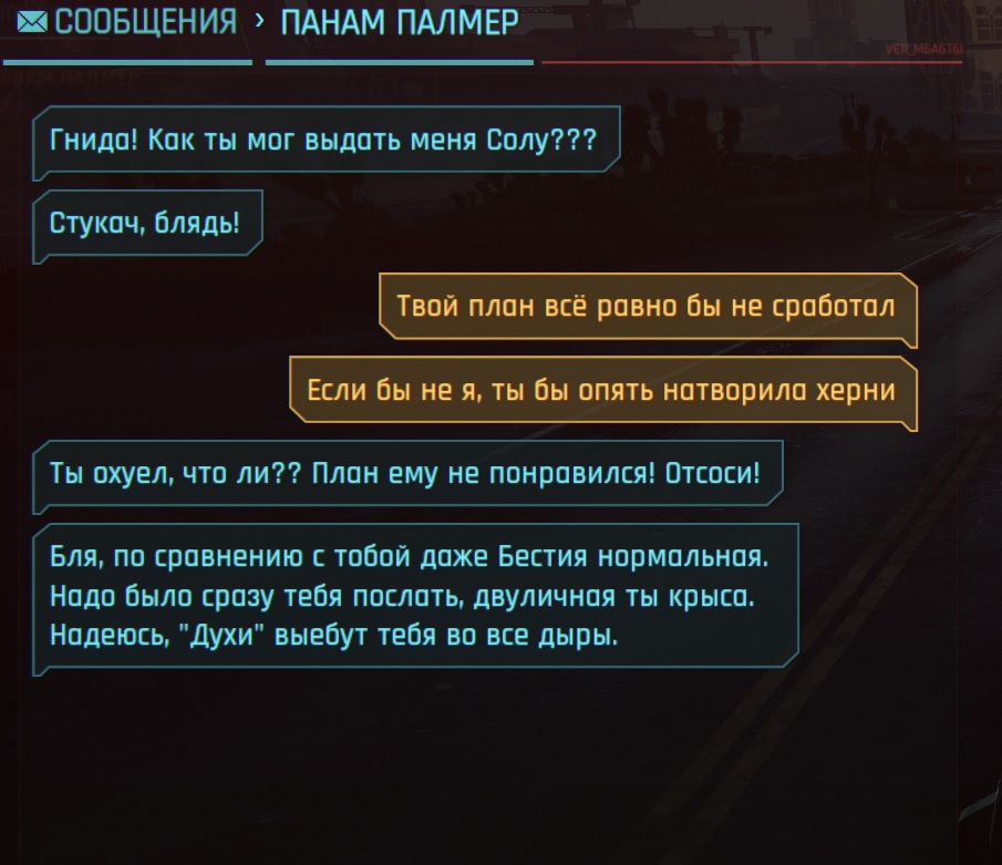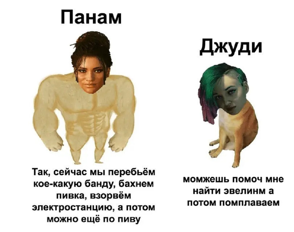 ФемВи - буквально отражение хтоничного декаданса кп2077: бесконечная смерть души и гниение бренных тушек под понпонщит в ярких тонах, который постоянно сменяется истерикой безнадежности и отсутствием вообще каких-либо вменяемых вариантов, которые вдохновляют на жизнь. Поменять ты можешь лишь цвет своей куртки, тачки и пушки. А могилка так и останется серым ящичком с амулетиком/любимым пистолетиком в Колумбарии. Даже "Альт" по факту черный ИИ, который просто хочет расширить свою модель за счет обучения на данных из новой энграммы. ТРАНСЦЕНДЕНТА НЕ БУДЕТ! ТВЕРДО И ЧЕТКО.