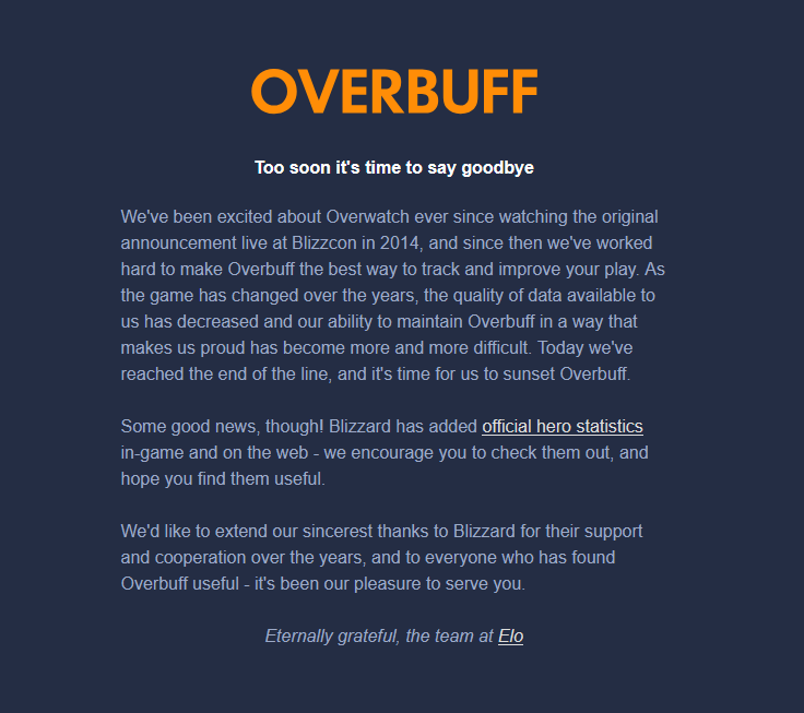 >>50437499 В 2025 году Blizzard запустили на сайте игры раздел с официальной статистикой. Она включает данные и закрытых профилей, к которым не было доступа у Overbuff. Поэтому создатели проекта приняли решение его закрыть.
