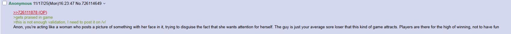 >>50436254 >7524.png Кто-то 7 лет назад похвалил тебя необосновано @ Хранишь этот скрин как священную скрижаль - каждый день открывать и любуешься, надрачивая свой мощный 3-сантиметровый болт.