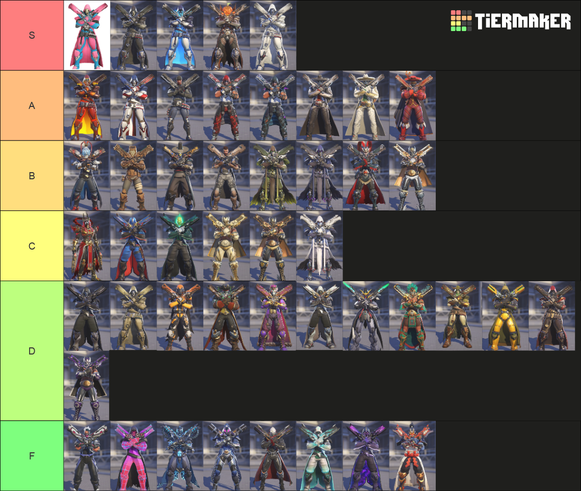 я беру свои слова, маскарадный скин это не D-тир. меня пиздец бесили вот эти сардельки вместо ног, поэтому я скин максимально не принимал, но так-то на повторном рассмотрении он пиздец охуенный. перемещаю его в A-тир