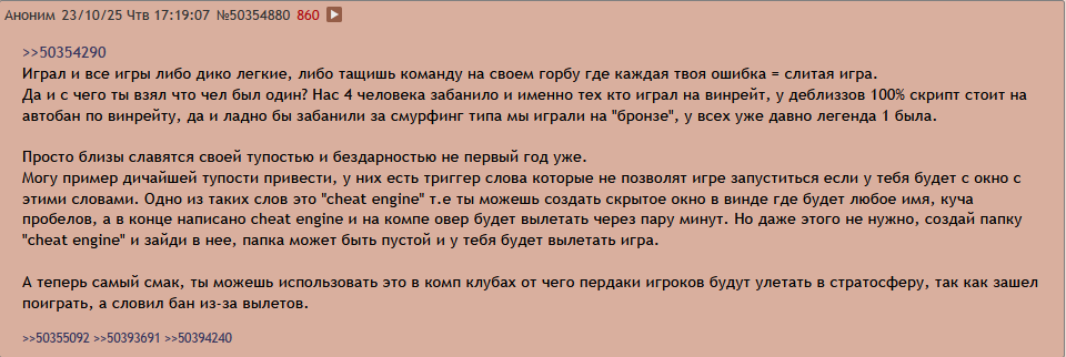 >а в оправдание своего читоблядства начинает воображать, что каждый второй в игре это или читак, или стример с подкруткой от близов, или пейтувин игрок, которому статы подкрутили после донатов. смена/удаление скинов или тупых эффектов это не читерство, это допиливание напильником аля моды тоже самое как в соло играх удалить тупой гринд чтобы не тратить время на мусор а о читах сужу по закрытым дискорд каналам, профа вынуждает там сидеть, да и самому в принципе интересно, так как там не дураки сидят пейтувин же опять по опыту сижу, сам внедрял системы такие, правда в мобилки