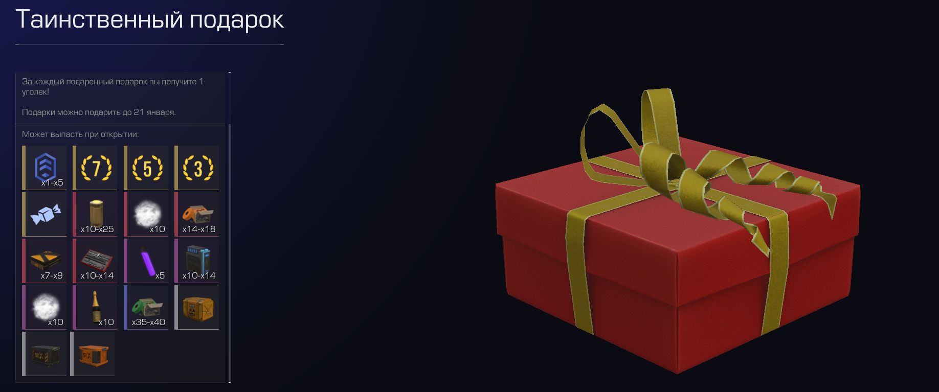 >>50557973 >>50558088 Если как в прошлом, то в мире как грибы будут спаунится подарки. Плюс падать с со всех активностей в награде. Подарки скармливаешь снеговику и он в лотерее дает сундуки. С сундуков падает годнота типо фамаса и всяких новогодних обвесов. Сейчас обвесы не в такой цене, а вот когда 30патронник на 7.62 продавался по 25 кк - выбить его было норм. Короче опенворлд вместе с буранами(вторыми выбросами) - лучший ивент.