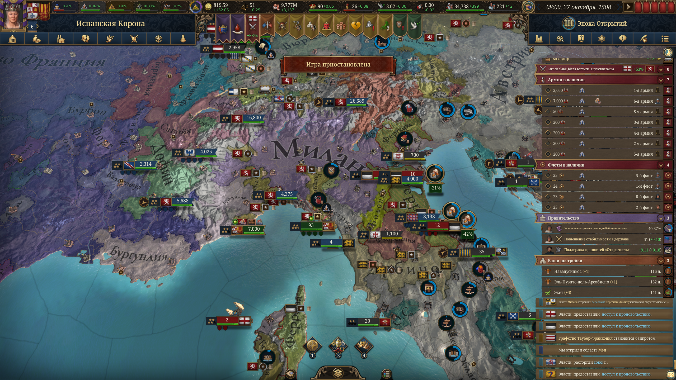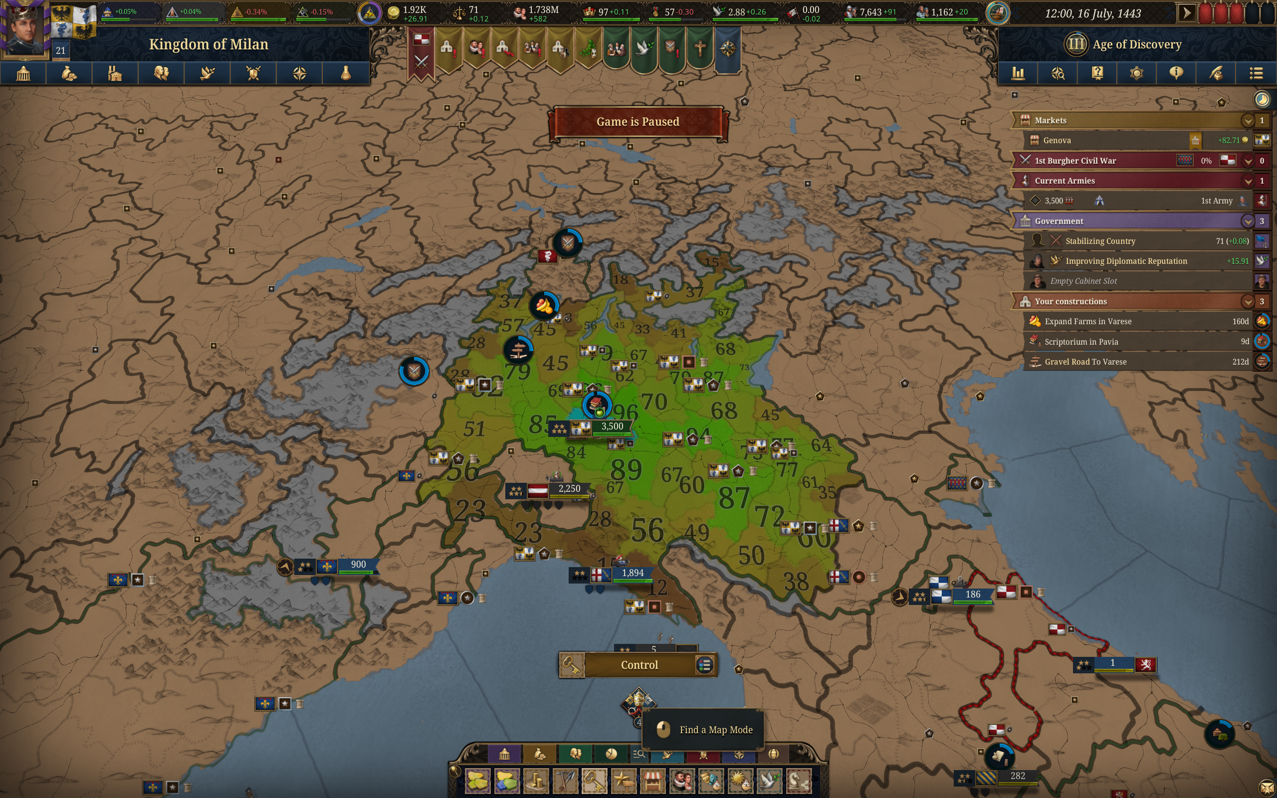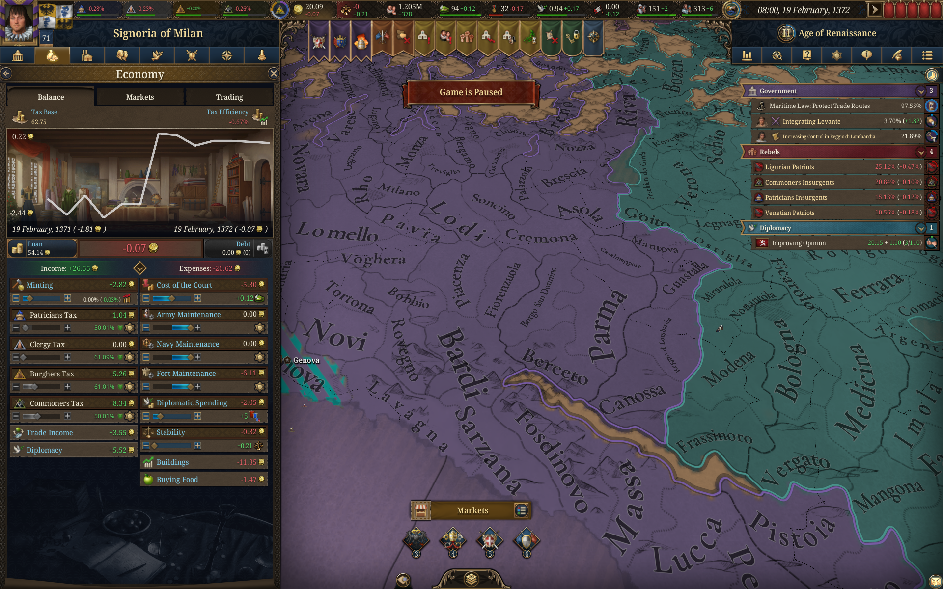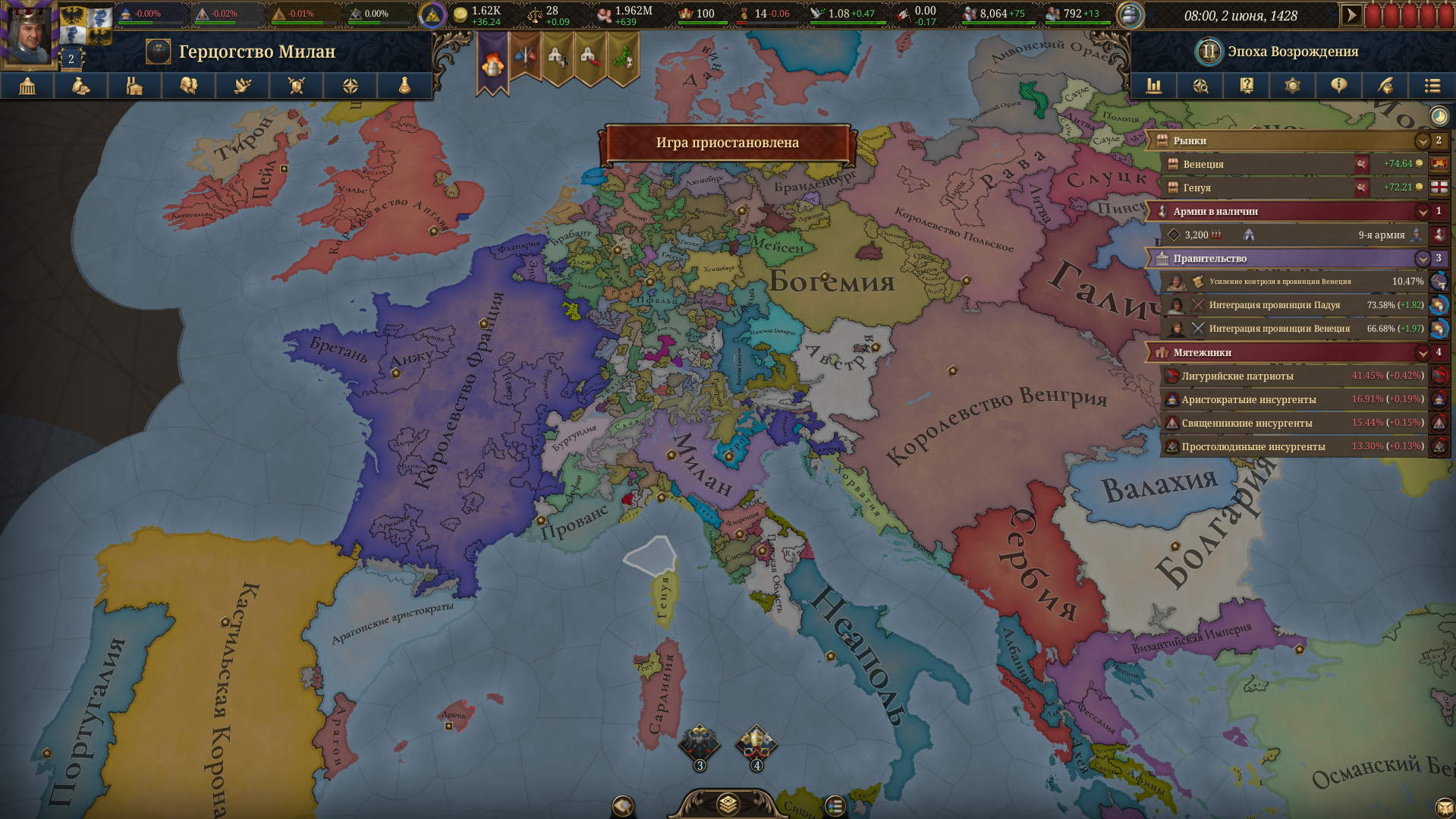 Планы на будущее, национализировать ебаннную Геную, потому что там повстанцы прям ебут, у них дебаф -50% Conqured, полагаю, за то, что я еще не национализировал их, приходится их давить советником чтобы они опять не брыкнули.