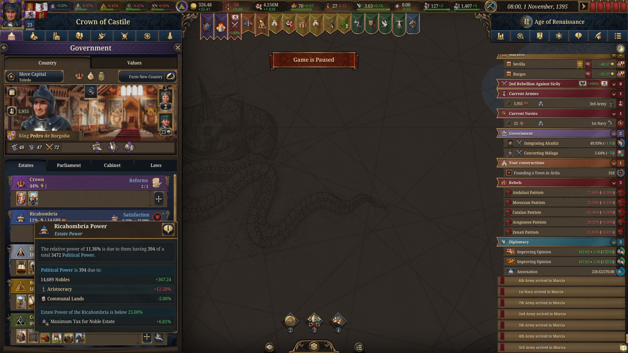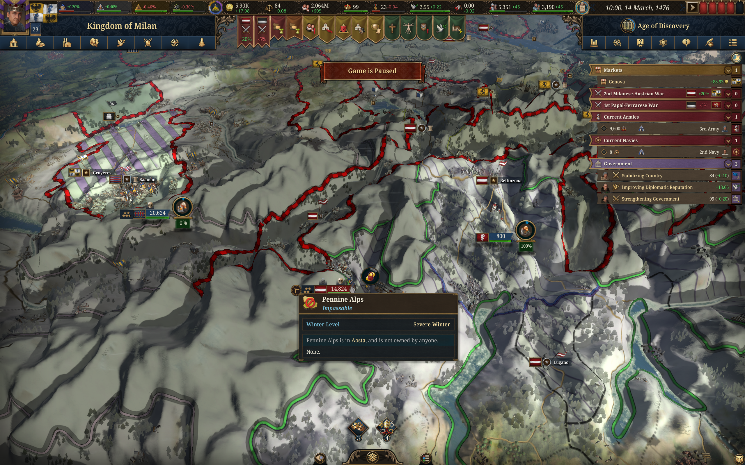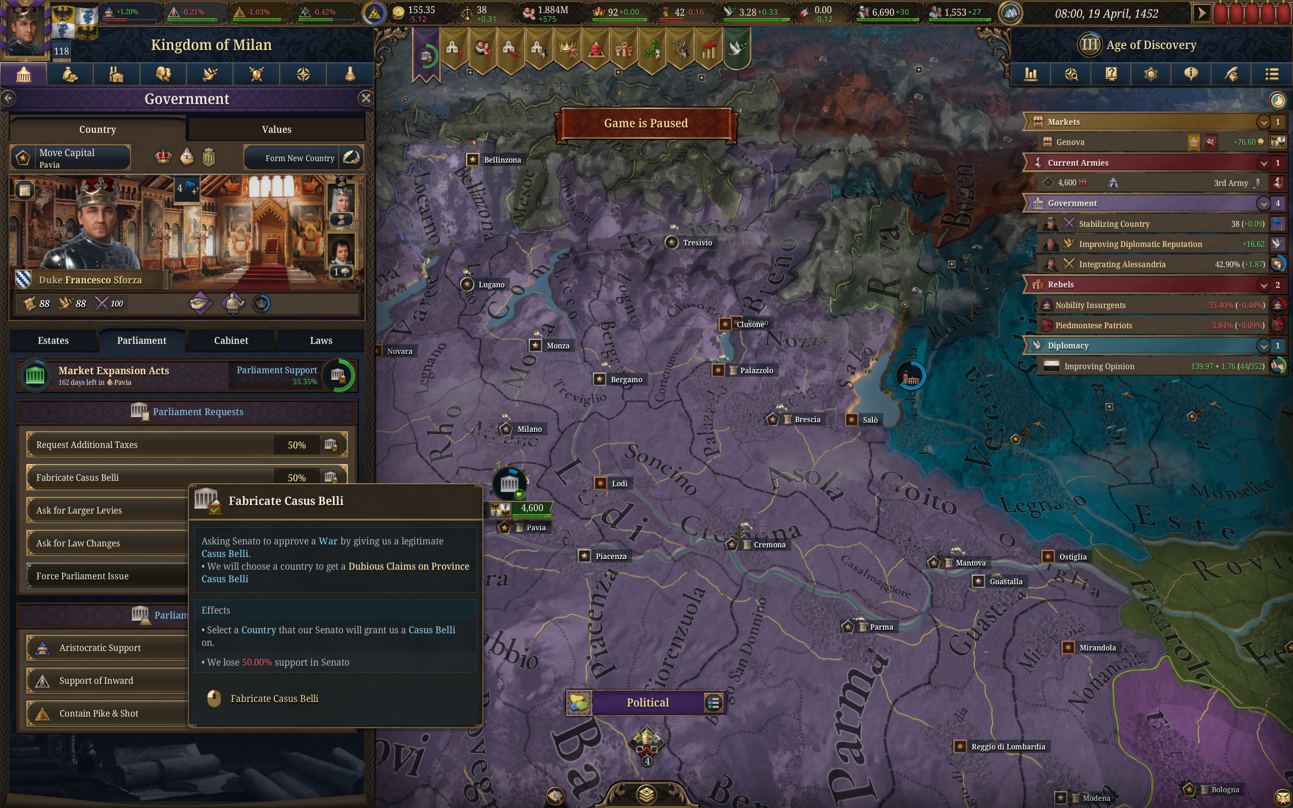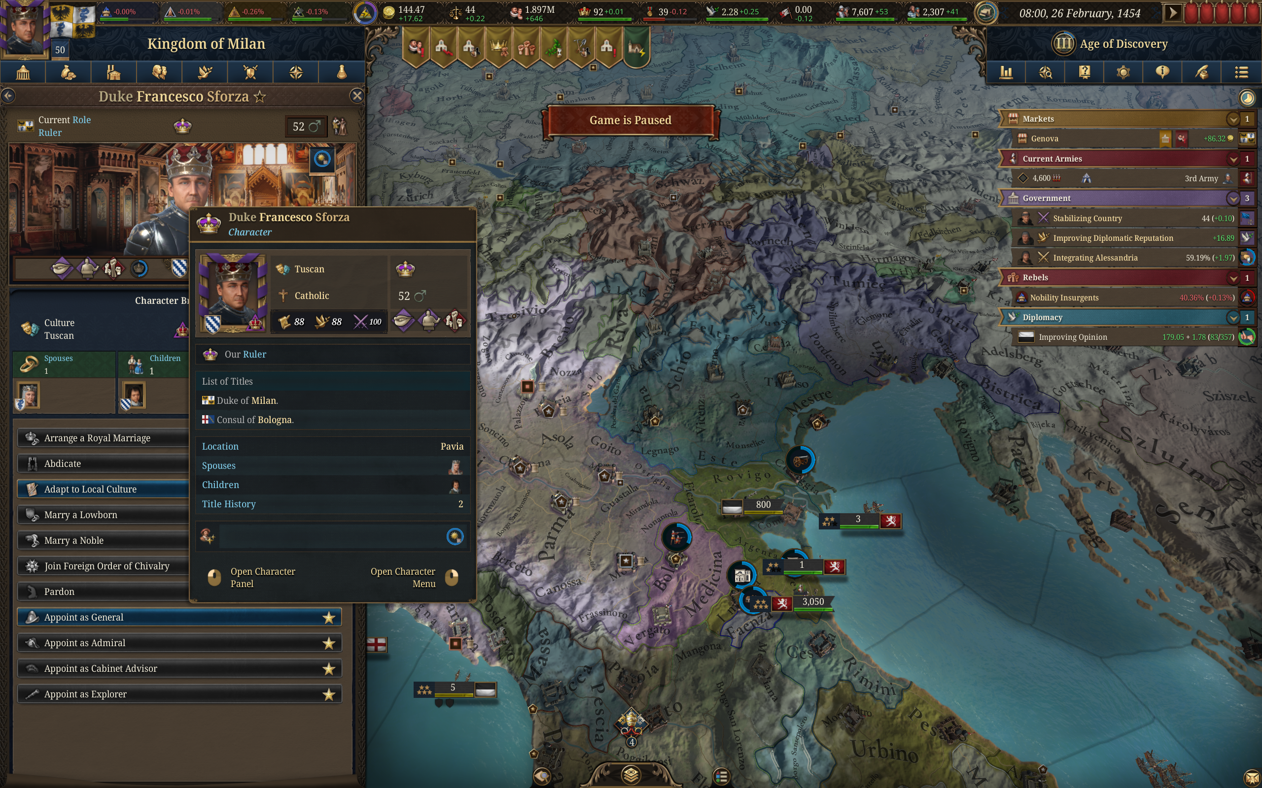 Планы на будущее, национализировать ебаннную Геную, потому что там повстанцы прям ебут, у них дебаф -50% Conqured, полагаю, за то, что я еще не национализировал их, приходится их давить советником чтобы они опять не брыкнули.