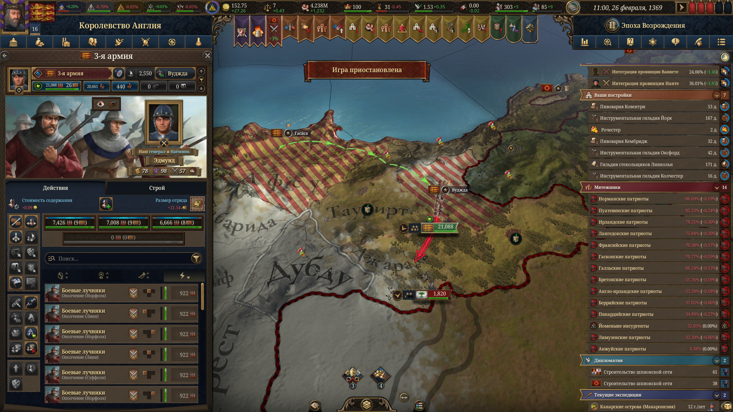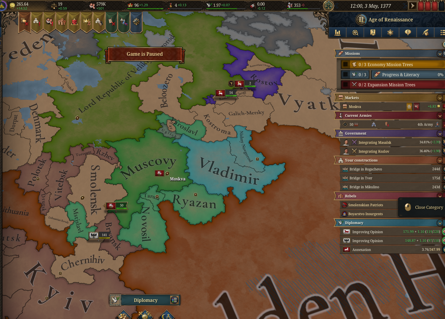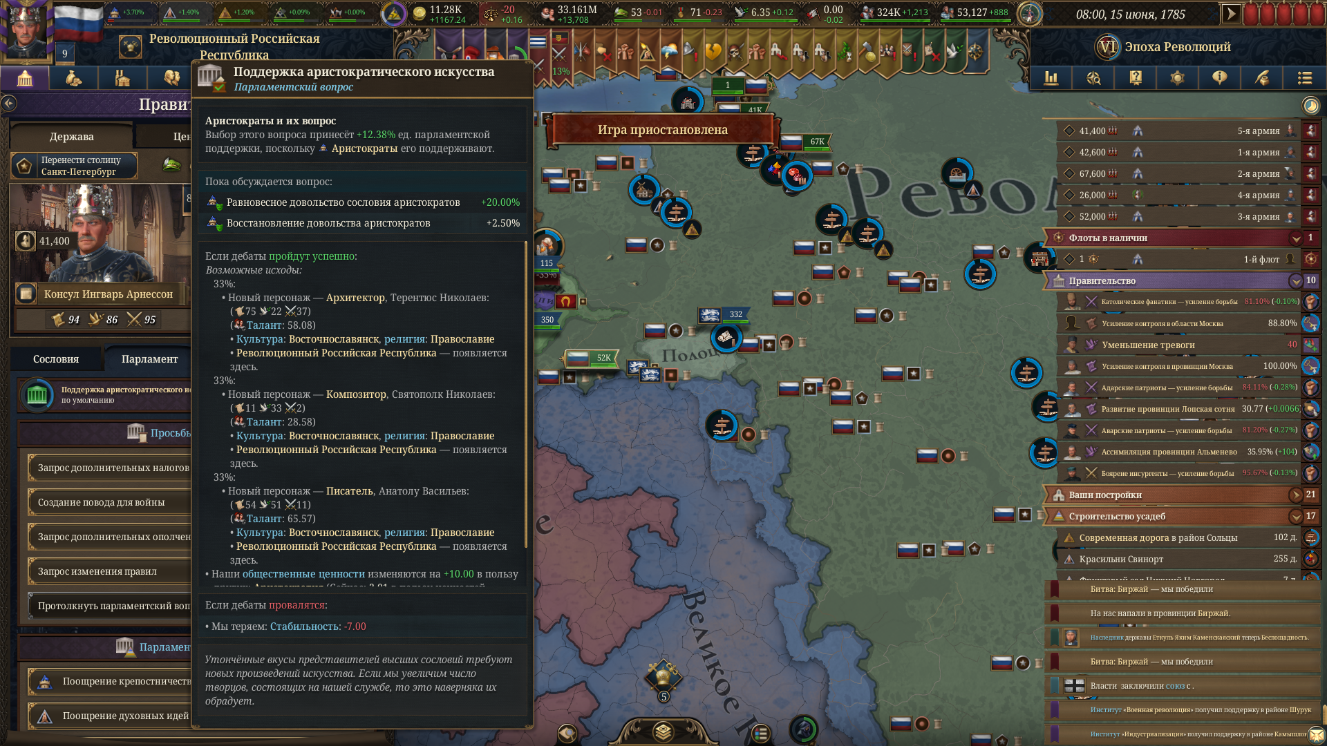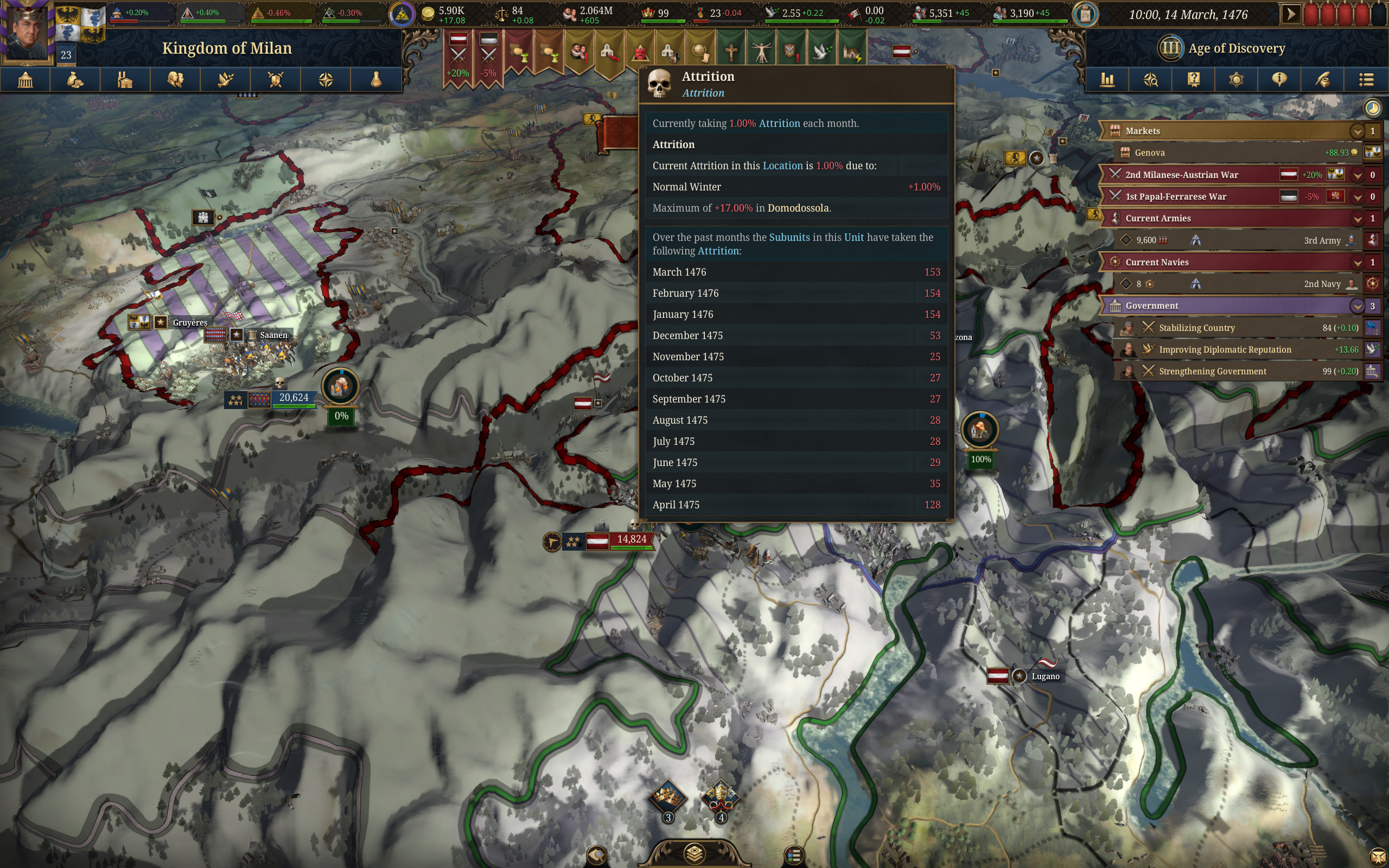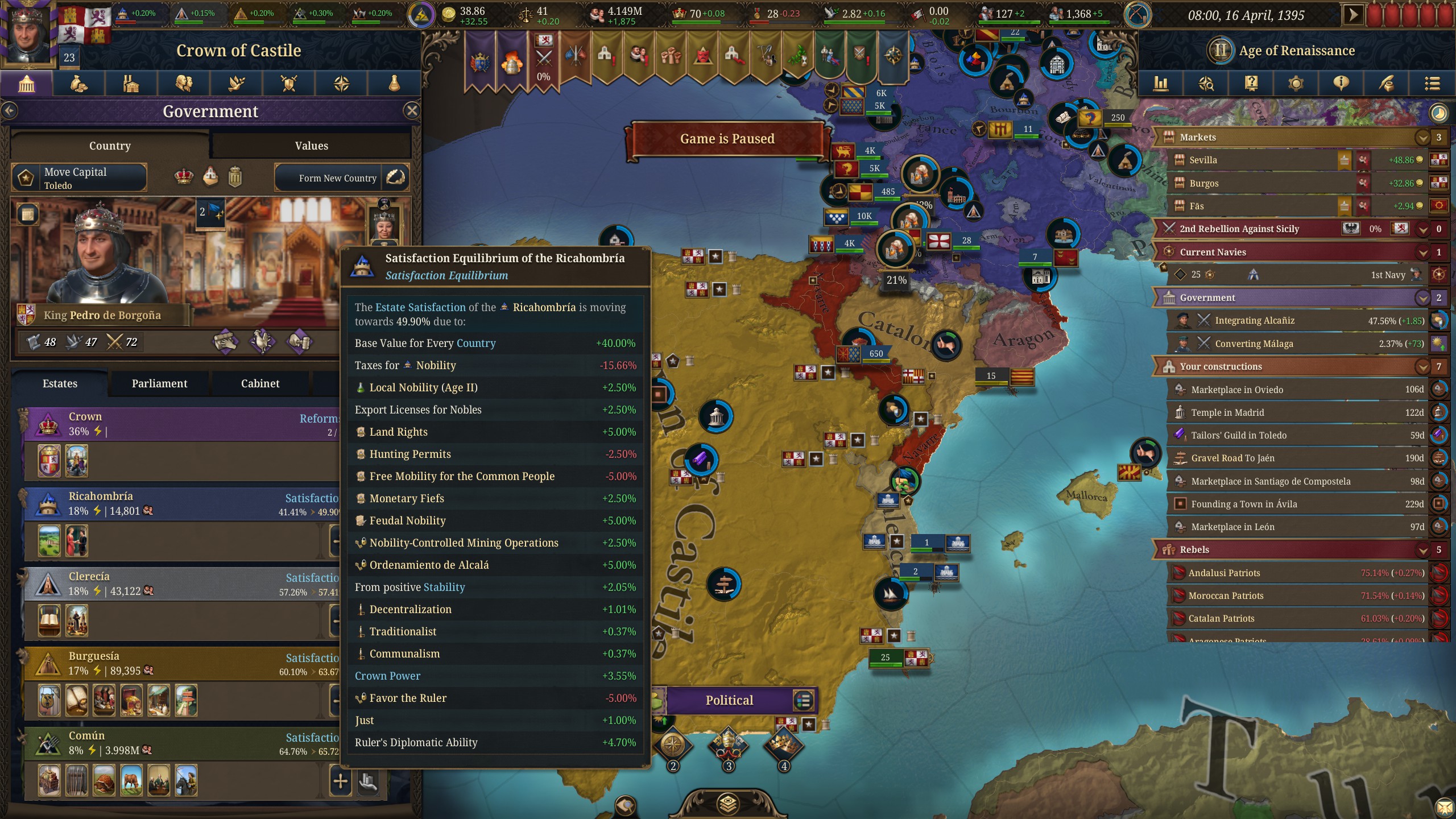 Планы на будущее, национализировать ебаннную Геную, потому что там повстанцы прям ебут, у них дебаф -50% Conqured, полагаю, за то, что я еще не национализировал их, приходится их давить советником чтобы они опять не брыкнули.