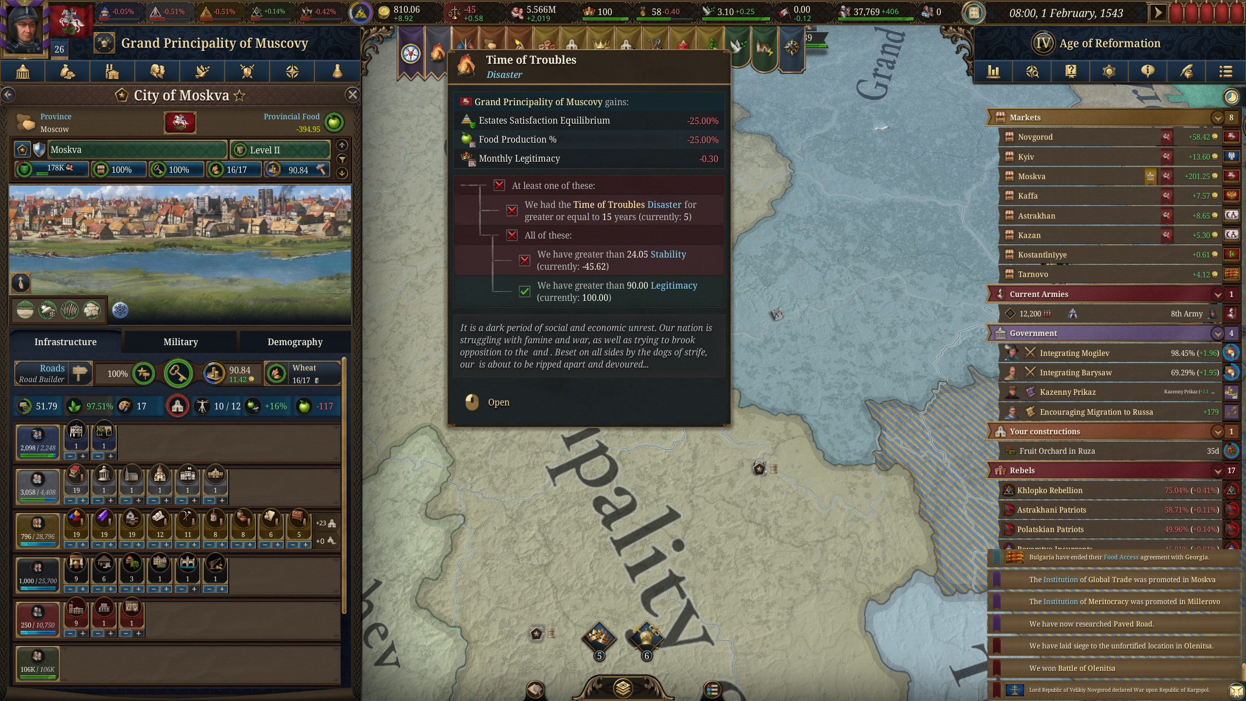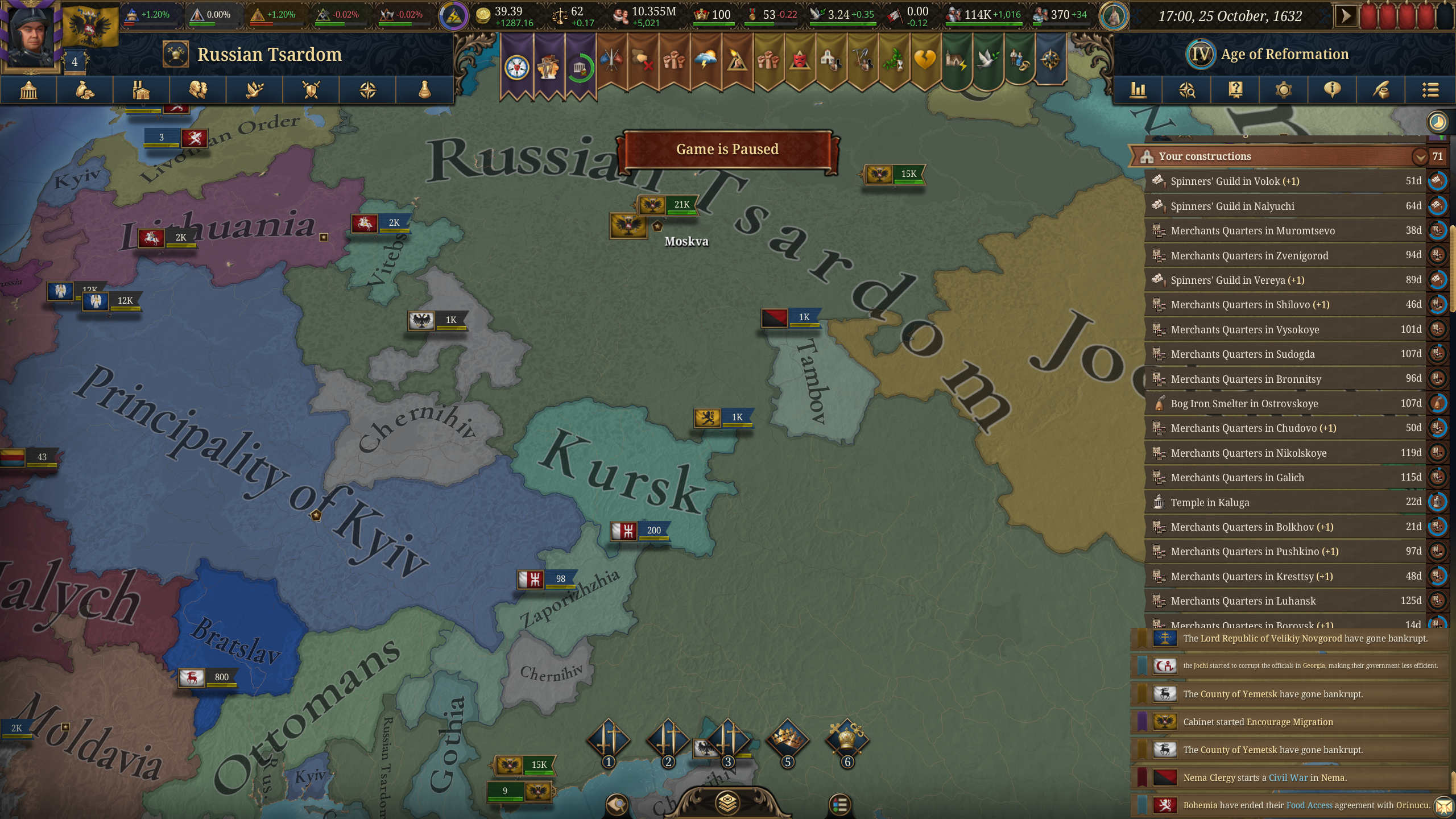 >>50422022 РГО это resource gatgering organizations, ты их расширяешь вообще? Города у тебя тоже нищие, кстати. Строй побольше зданий в столице и в окрестностях, на плохих ресурсах рядом со столицей строй города, на хороших ресурсах не строй города, строй рго.