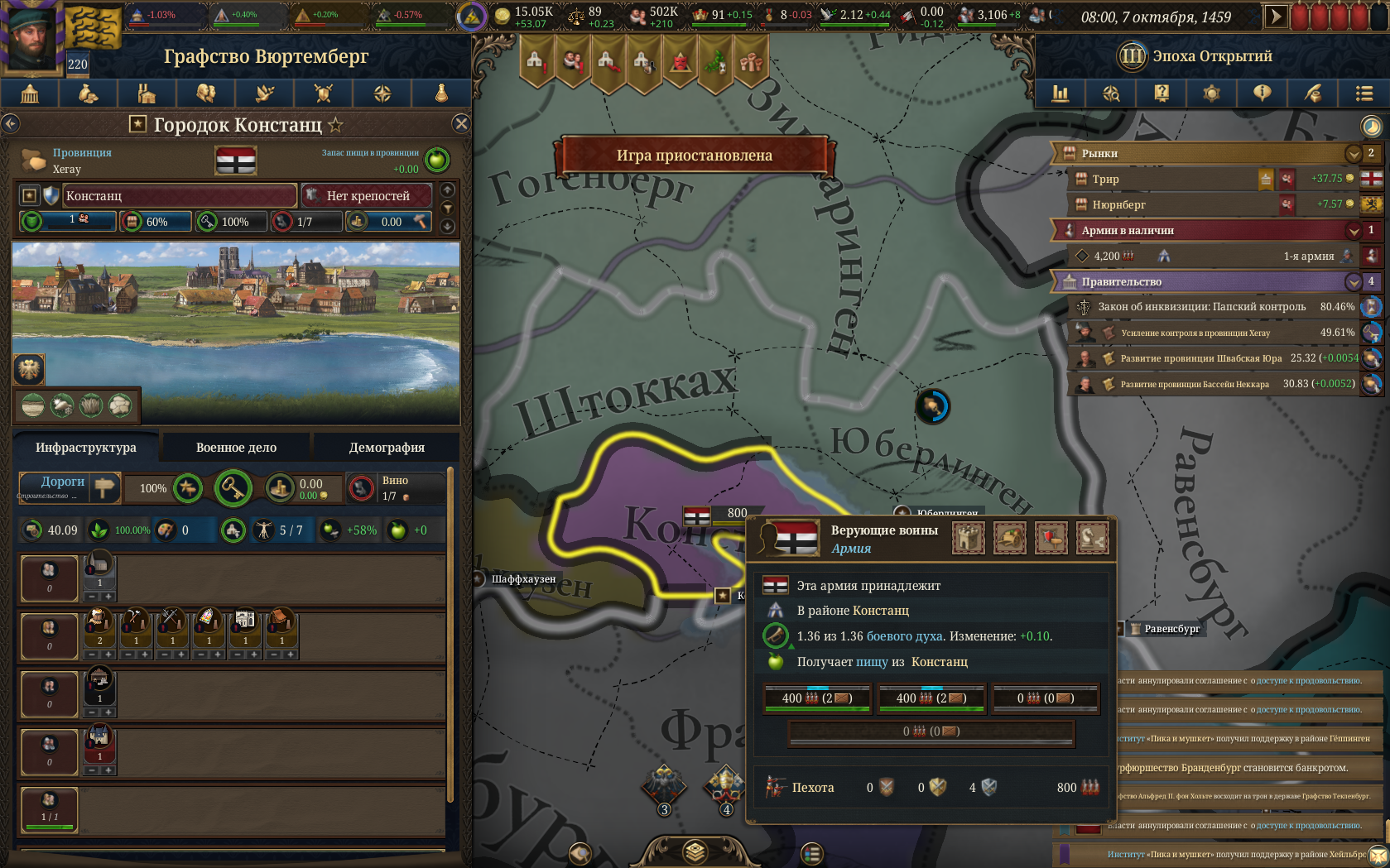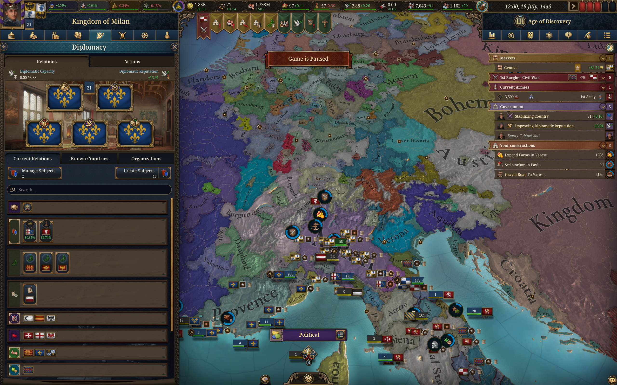 Вот такой подпивасный покрас на начало еу4. На самом деле дальше лезть уже нет смысла - контроль будет никакущий. Особенно с Генуей всё печально, но вся проблема в Алессандрии, точнее с Австрией, которая сделала эту хуйню своим вассалом, как и кучу других миноров. Благо на это он всрал всю свою ёмкость дипломатии, так что мой союз с Папой и Неаполем ожидает возможности влететь в этого пидараса на габсбурге. Из помойки под названием сри вылетел ещё в 14 веке после срача гвельфов и гибеллинов, фраха закончила столетнюю войну лет за пятьдесят и сейчас гегемон всего и вся. Если у фрахи будет казус ьелли по ивенту для влёта в меня, то мне страшно.