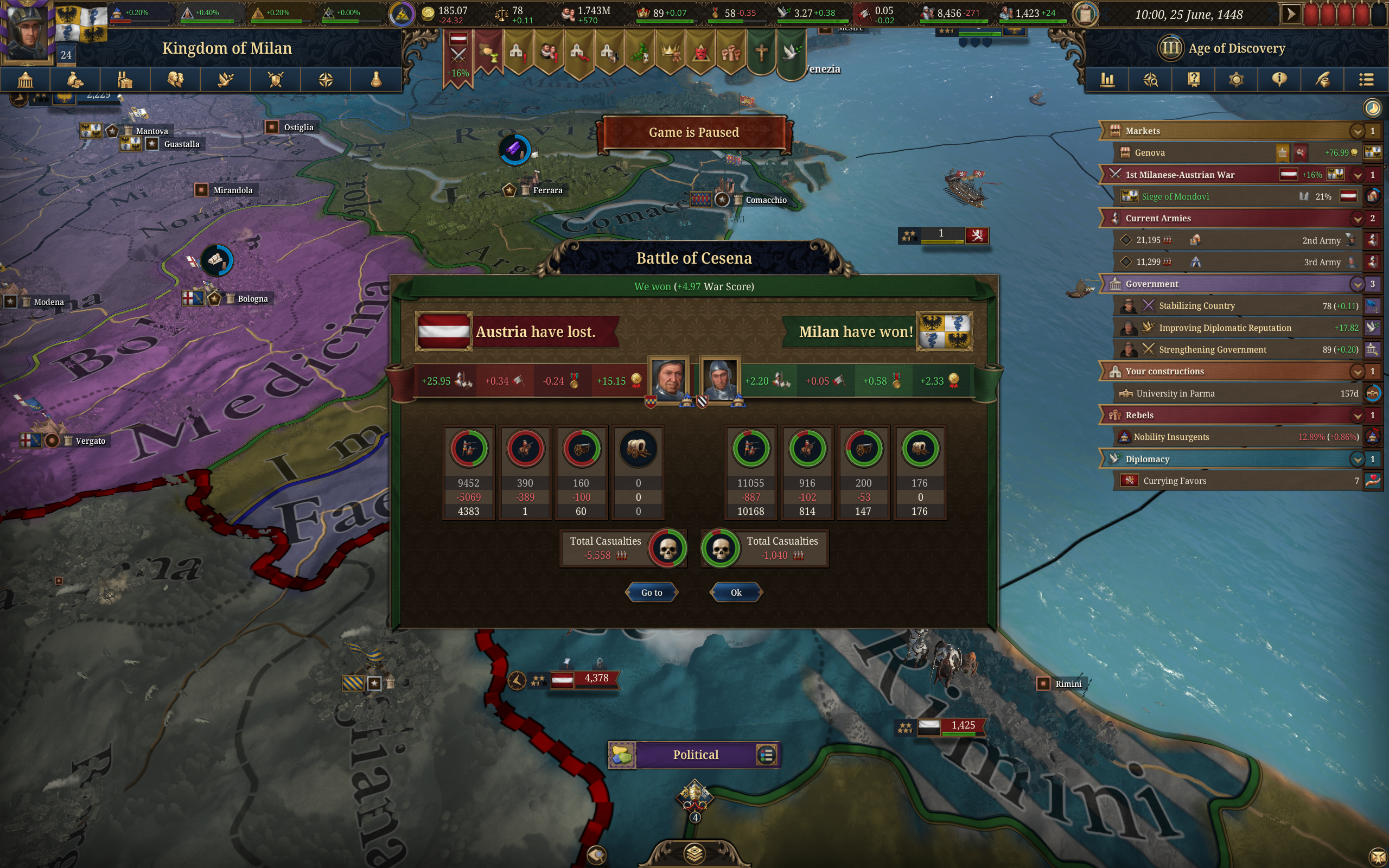 Ну а тем временем Австрия какая-то жиденькая попалась. За один раз Ареццо и Сиену не смог сделать вассалами, в следующую войну выкину Австрию из Италии. Ну и Генуя теперь с более-менее нормальным контролем теперь.
