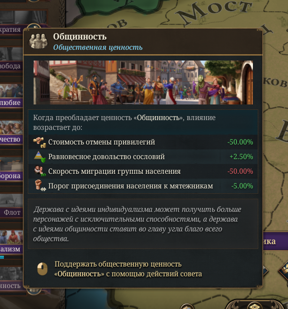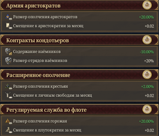 >>50430299 >Убираем максимально привелегии в дно дворянство. Так? Не совсем. Ты всю игру по экономическим причинам будешь усилять горожан, но с их усилением они будут платить меньше налогов и для борьбы с этим тебе придется держать высоким аристократизм в пику плутократизму, а для него нужны привилегии аристократии.