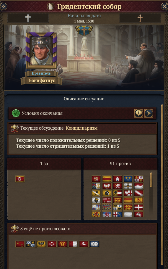 Очень тупо реализован Тридентсткий собор, ибо предлагая решения против папы, у тебя не будет поддержки вообще. И не понятно почему, у папы есть соперники-католики, но они все равно его поддерживают