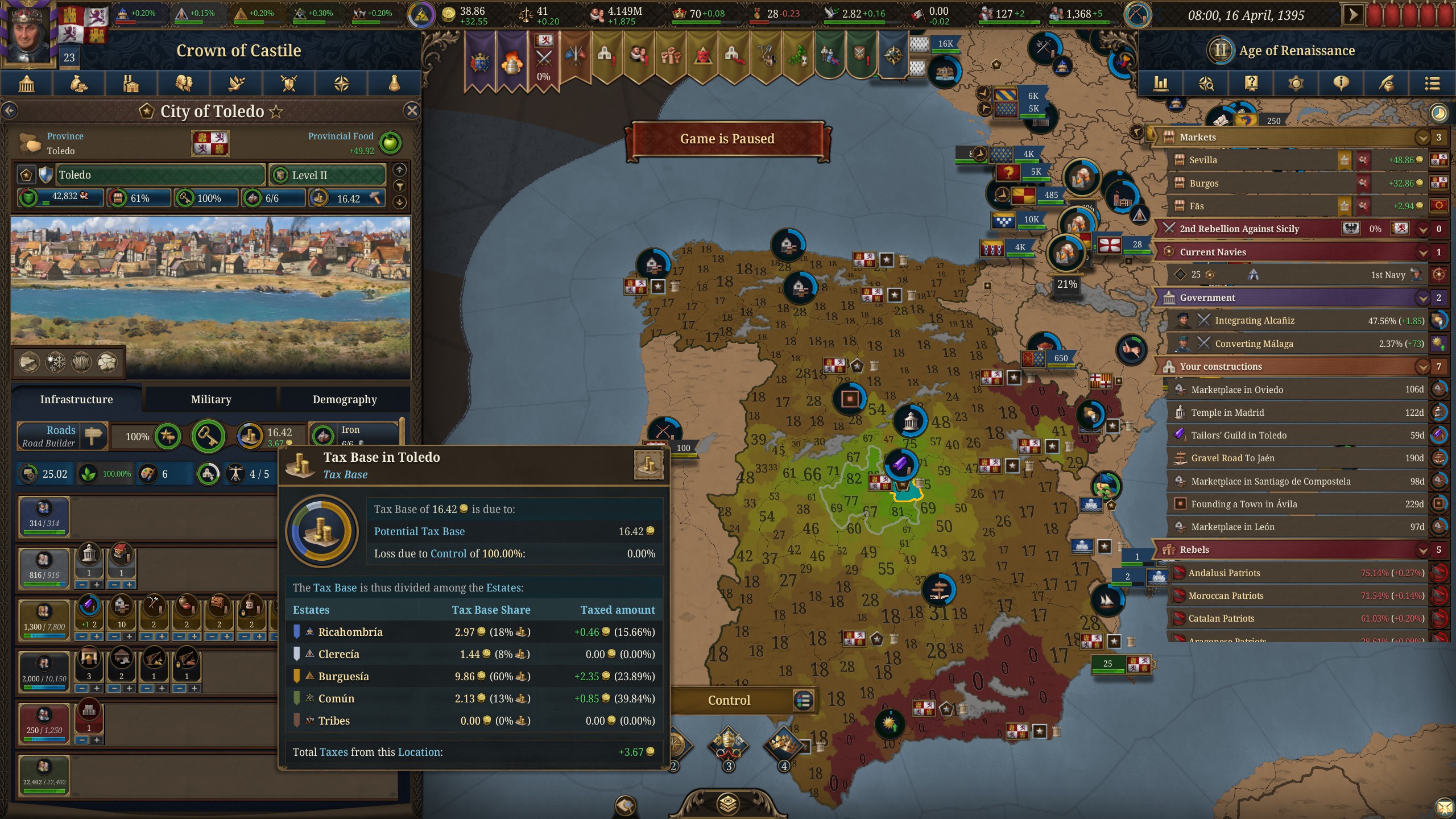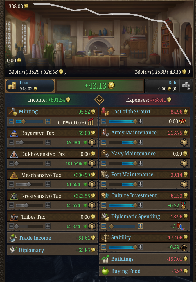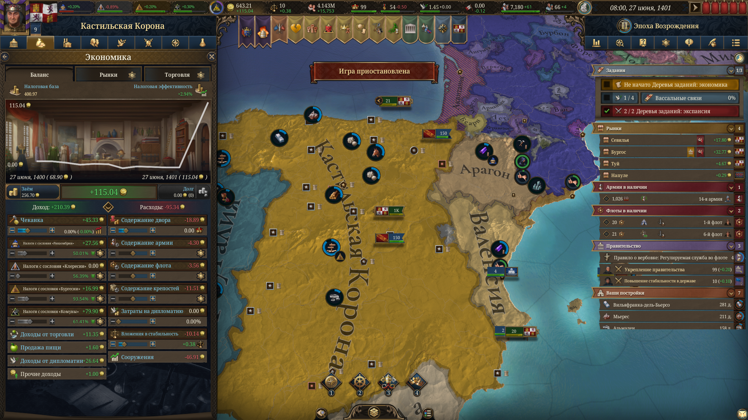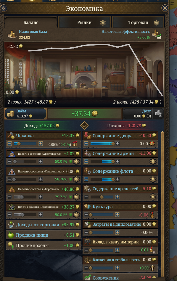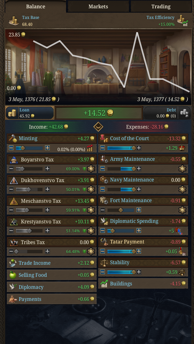 как за кастилию не сосать с деньгами? 1370 год, я в топе по населению, но доходов всего 50 дукатов тотал, при этом налоги выкручены на максимум для бургеров (но с них капает только 3 дуката) и пезантов. Ноблы негодуют, с них налогов по минималке, тоже где-то три дуката. Но я смотрю на леджер, я даже не в десятке по инкаму. Смотрю на соседей - они домиками радостно застраиваются, а у меня баланс околонулевой, любой негативный эвент отправляет займ брать.